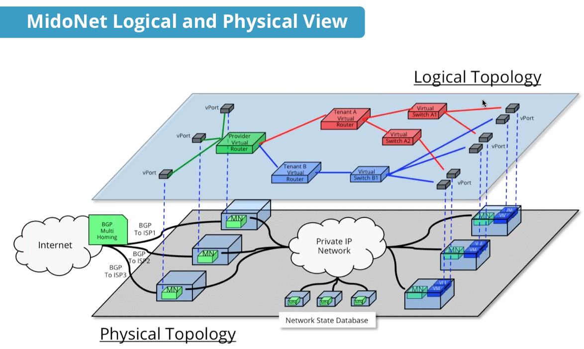 (左图-图3: 计算虚拟化和网络虚拟化。来源) (右图-图4:来源 MidoNet 提供的物理网络和逻辑网络的映射)