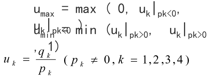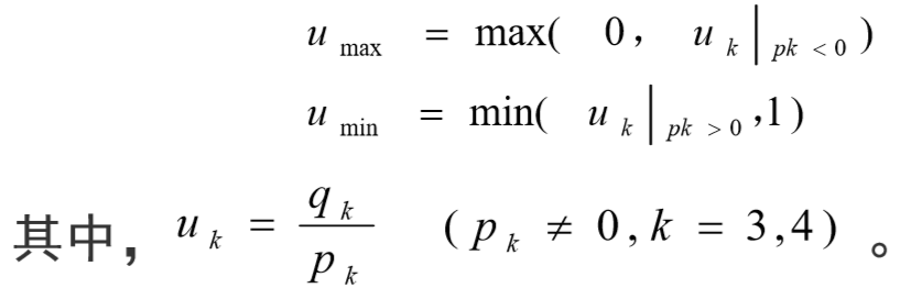 若△X=0,则p1=p2=0,此时进一步判断是否满足q1<0或q2<0 ,若满足,则该直线段不在窗口内,算法转(7)-结束。否则 ,满足q1≥0且q2≥0,则进一步计算umax和umin :
