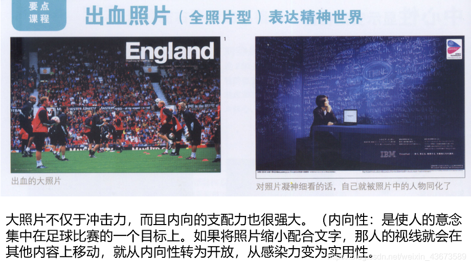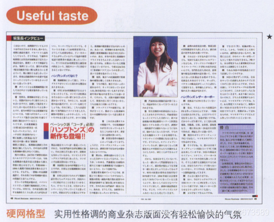 出血版有内向性,横幅覆盖的出血版也就是把版面式样的全照片型,表达了内向的趣味性。四边由水平、垂直线包围,也是方版的一种。因为不含斜线,排除了活泼性,表达了高格调和趣味性。