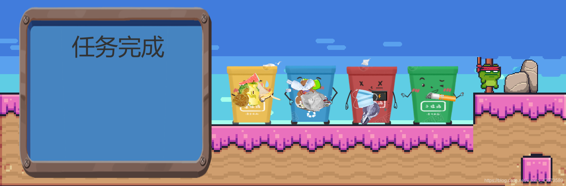 设置四个垃圾桶为触发器,玩家一旦碰到触发器,则激活垃圾分类的对话框。