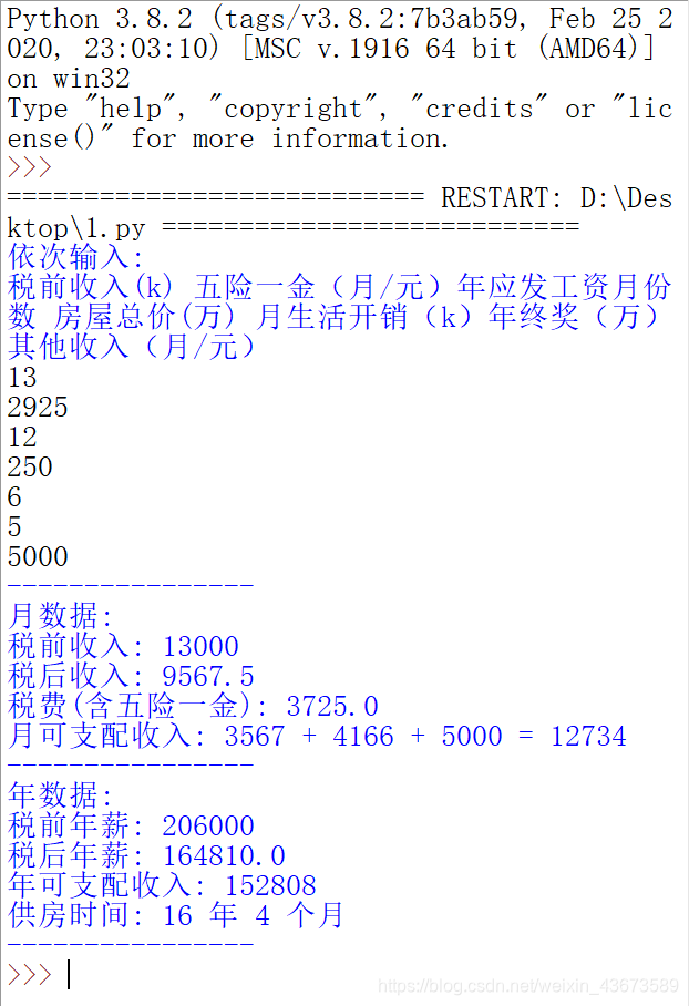 print("税前收入(k) 五险一金(月/元)年应发工资月份数 房屋总价(万) 月生活开销(k)年终奖(万)其他收入(月/元)")