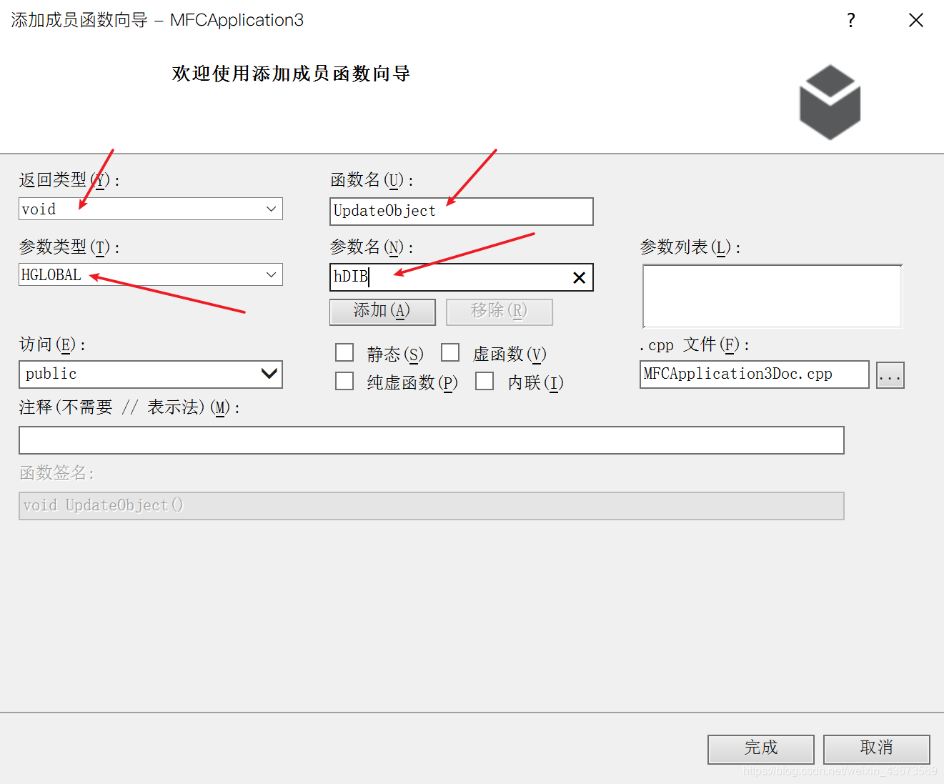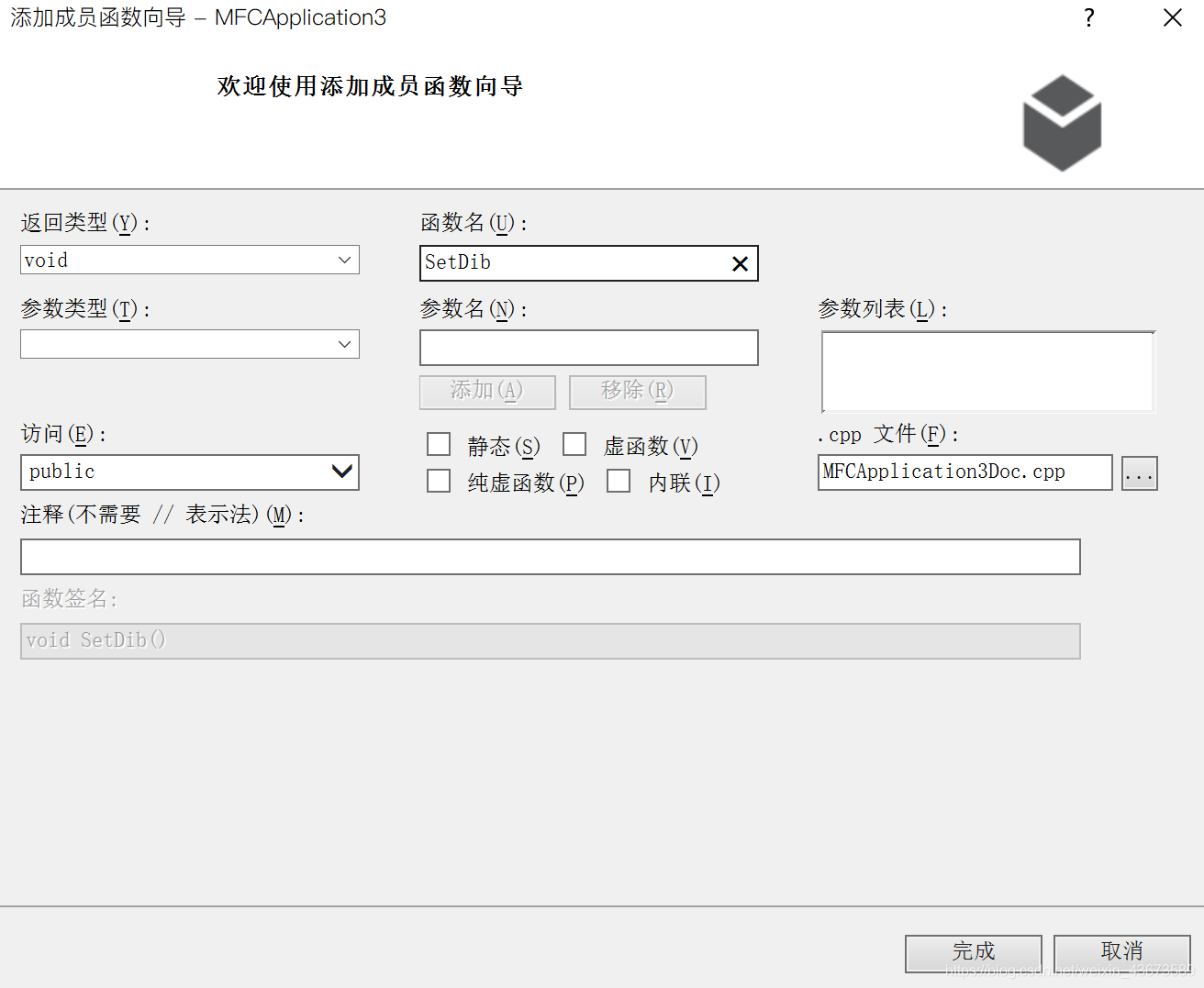 void C********Doc::SetDib() //这个函数需要手动添加,前面的类名要与项目一致 { LPSTR lpdib = (LPSTR) ::GlobalLock((HGLOBAL) m_hDIB); if (m_dib.GetWidth(lpdib) > INT_MAX ||m_dib.GetHeight(lpdib) > INT_MAX)// 判断图象是否过大 { ::GlobalUnlock((HGLOBAL) m_hDIB); ::GlobalFree((HGLOBAL) m_hDIB); // 释放DIB对象 m_hDIB = NULL;// 设置DIB为空 AfxMessageBox(L"初始化失败"); return; } m_sizeDoc = CSize((int)m_dib.GetWidth(lpdib), (int)m_dib.GetHeight(lpdib));// 设置文档大小 ::GlobalUnlock((HGLOBAL) m_hDIB); m_palDIB = new CPalette;// 创建新调色板 if (m_palDIB == NULL)// 判断是否创建成功 { ::GlobalFree((HGLOBAL) m_hDIB); // 失败 m_hDIB = NULL;// 设置DIB对象为空 return; } // 调用CreateDIBPalette来创建调色板 if (m_dib.ConstructPalette(m_hDIB, m_palDIB) == NULL) { delete m_palDIB;// 删除 m_palDIB = NULL;// 设置为空 return;// 返回空 } }void C********Doc::UpdateObject(HGLOBAL hDIB) //这个函数需要手动添加,类名要修改 { if (m_hDIB != NULL) // 判断DIB是否为空 { ::GlobalFree((HGLOBAL) m_hDIB);// 非空,则清除 } m_hDIB = hDIB; // 替换成新的DIB对象 }