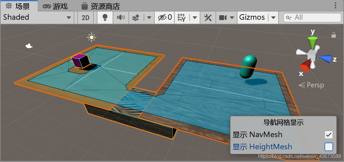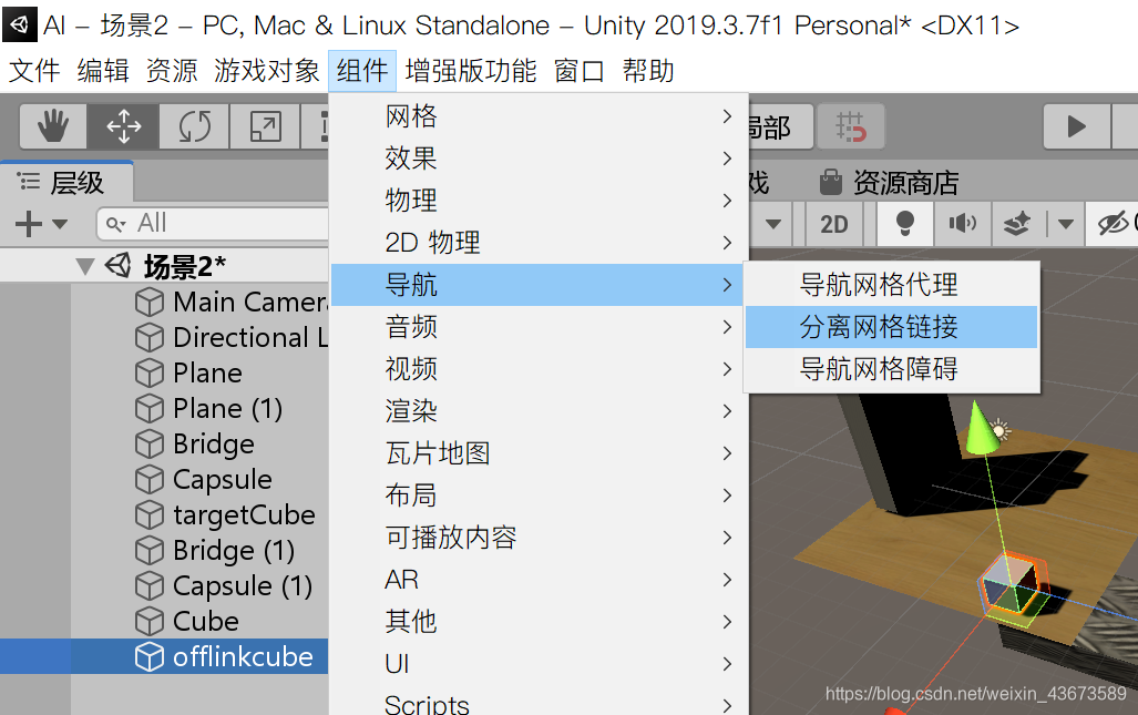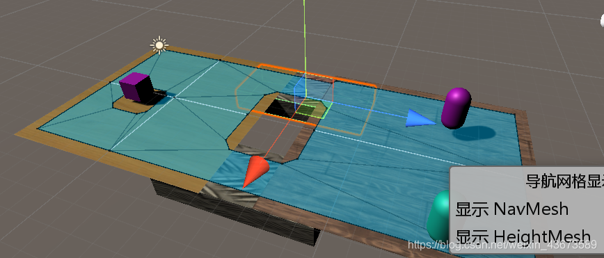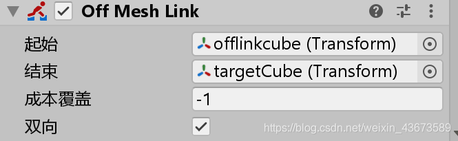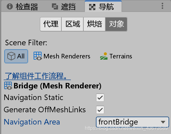 using System.Collections; using System.Collections.Generic; using UnityEngine; using UnityEngine.AI; public class NMOCtrl : MonoBehaviour { private NavMeshObstacle obs; // Start is called before the first frame update void Start() { obs = this.GetComponent<NavMeshObstacle>(); obs.enabled = true; } // Update is called once per frame void Update() { if(Input.GetButtonDown("Fire1")) { if (obs) { obs.enabled = false; this.GetComponent<Renderer>().material.color = Color.green; } } if (Input.GetButtonUp("Fire1")) { if (obs) { obs.enabled = true; this.GetComponent<Renderer>().material.color = Color.red; } } } }绑定到桥上即可