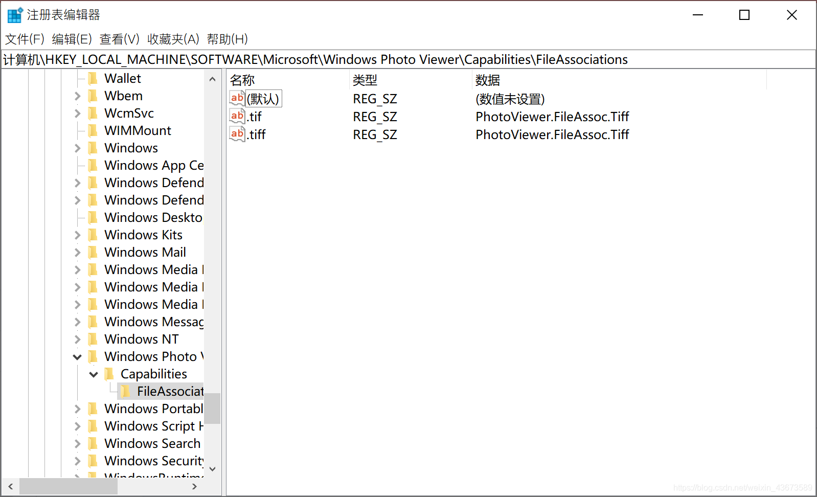 计算机\HKEY_LOCAL_MACHINE\SOFTWARE\Microsoft\Windows Photo Viewer\Capabilities\FileAssociations