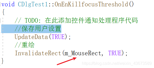 void CDlgTest1::OnEnChangeThreshold() { // TODO: 如果该控件是 RICHEDIT 控件,它将不 // 发送此通知,除非重写 CDialogEx::OnInitDialog() // 函数并调用 CRichEditCtrl().SetEventMask(), // 同时将 ENM_CHANGE 标志“或”运算到掩码中。 // TODO: 在此添加控件通知处理程序代码 //更新 UpdateData(TRUE); //重绘 InvalidateRect(m_MouseRect, TRUE); }注意: