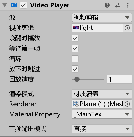 using System.Collections; using System.Collections.Generic; using UnityEngine; public class VedioPlayerControl : MonoBehaviour { public UnityEngine.Video.VideoClip VideoClip;//定义一个视频变量,公开 // Start is called before the first frame update void Start() { //实际上就是通过代码的方式手动指定视频播放组件的基本属性 var videoPlayer = gameObject.AddComponent<UnityEngine.Video.VideoPlayer>();//获取视频组件 var audioSource = gameObject.AddComponent<AudioSource>();//声音组件 videoPlayer.playOnAwake = false;//唤醒时播放 videoPlayer.clip = VideoClip; videoPlayer.renderMode = UnityEngine.Video.VideoRenderMode.MaterialOverride;//视频渲染方法 videoPlayer.targetMaterialRenderer = GetComponent<Renderer>(); videoPlayer.targetMaterialProperty = "_MainTex";//材质属性 videoPlayer.audioOutputMode = UnityEngine.Video.VideoAudioOutputMode.AudioSource;//音频输出方式 videoPlayer.SetTargetAudioSource(0, audioSource); } // Update is called once per frame void Update() { //交互方式 if (Input.GetButtonDown("Jump"))//按下空格键 { var vp = GetComponent<UnityEngine.Video.VideoPlayer>();//调用视频播放组件 if (vp.isPlaying)//在播放状态就暂停,反之亦然 { vp.Pause(); } else { vp.Play(); } } } }把脚本绑定到平面上,指定视频