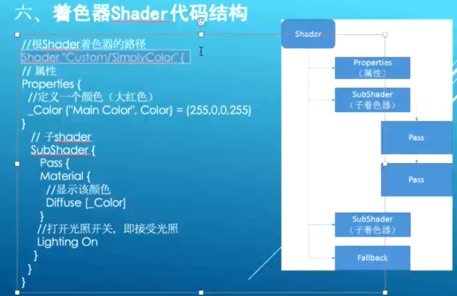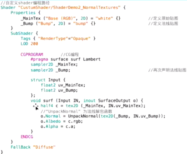 Shader "Custom/DiffuseSurfaceShader" { Properties { _Color ("Color", Color) = (1,1,1,1) _MainTex ("Albedo (RGB)", 2D) = "white" {} _Glossiness ("Smoothness", Range(0,1)) = 0.5 _Metallic ("Metallic", Range(0,1)) = 0.0 } SubShader { Tags { "RenderType"="Opaque" } LOD 200 CGPROGRAM // Physically based Standard lighting model, and enable shadows on all light types #pragma surface surf Standard fullforwardshadows // Use shader model 3.0 target, to get nicer looking lighting #pragma target 3.0 sampler2D _MainTex; struct Input { float2 uv_MainTex; }; half _Glossiness; half _Metallic; fixed4 _Color; // Add instancing support for this shader. You need to check 'Enable Instancing' on materials that use the shader. // See https://docs.unity3d.com/Manual/GPUInstancing.html for more information about instancing. // #pragma instancing_options assumeuniformscaling UNITY_INSTANCING_BUFFER_START(Props) // put more per-instance properties here UNITY_INSTANCING_BUFFER_END(Props) void surf (Input IN, inout SurfaceOutputStandard o) { // Albedo comes from a texture tinted by color fixed4 c = tex2D (_MainTex, IN.uv_MainTex) * _Color; o.Albedo = c.rgb; // Metallic and smoothness come from slider variables o.Metallic = _Metallic; o.Smoothness = _Glossiness; o.Alpha = c.a; } ENDCG } FallBack "Diffuse" }在此处选择着色器