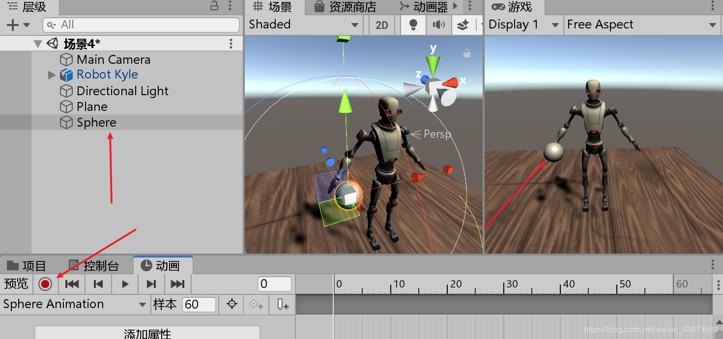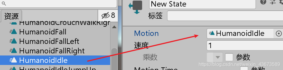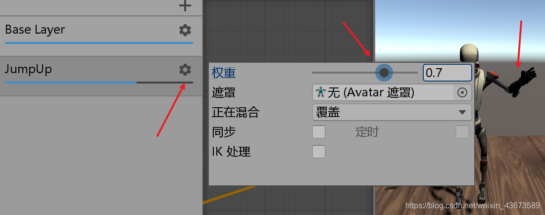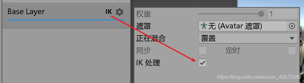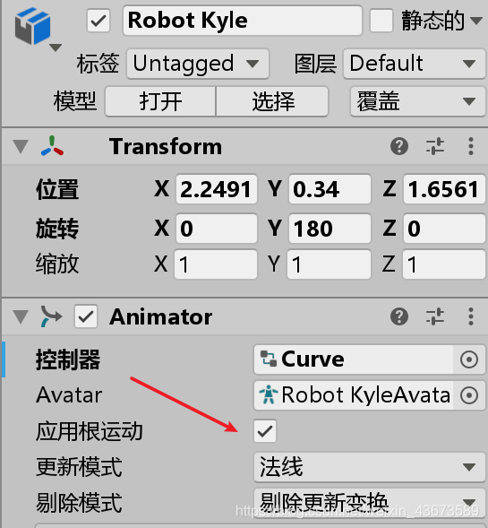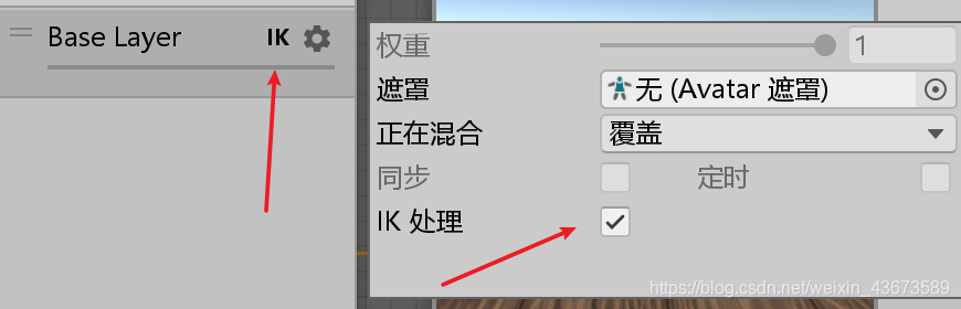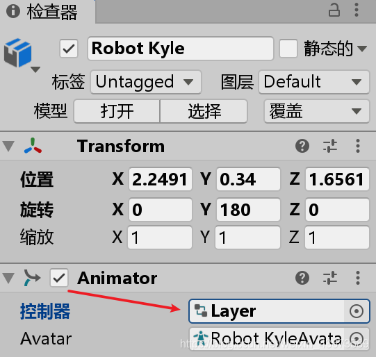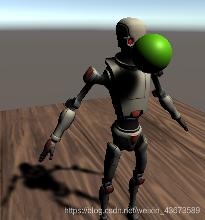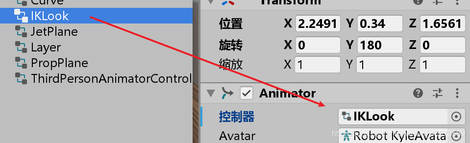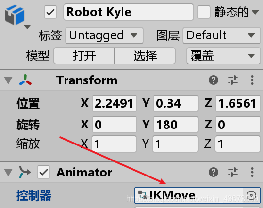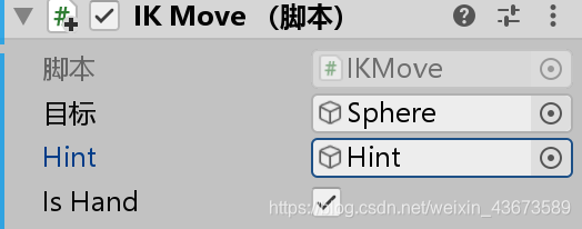 using System.Collections; using System.Collections.Generic; using UnityEngine; [RequireComponent(typeof(Animator))]//强制添加安妮梅特组件 public class IKMove : MonoBehaviour { public GameObject target;//创建够的目标的变量 public GameObject hint;//参照物 Animator anim; public bool isHand = true; // Start is called before the first frame update void Start() { anim = GetComponent<Animator>();//获取组件 } // Update is called once per frame void Update() { } private void OnAnimatorIK(int layerIndex) { AvatarIKGoal g = isHand ? AvatarIKGoal.RightHand : AvatarIKGoal.RightFoot; AvatarIKHint h = isHand ? AvatarIKHint.RightElbow : AvatarIKHint.RightKnee; anim.SetIKPositionWeight(g, 1f);//设置位置的权重 anim.SetIKPosition(g, target.transform.position);//设置位置 anim.SetIKRotationWeight(g, 1f);//设置旋转及其权重 anim.SetIKRotation(g, target.transform.rotation); anim.SetIKHintPositionWeight(h, 1f); anim.SetIKHintPosition(h, hint.transform.position); } }绑定到机器人上并如下图设置参数