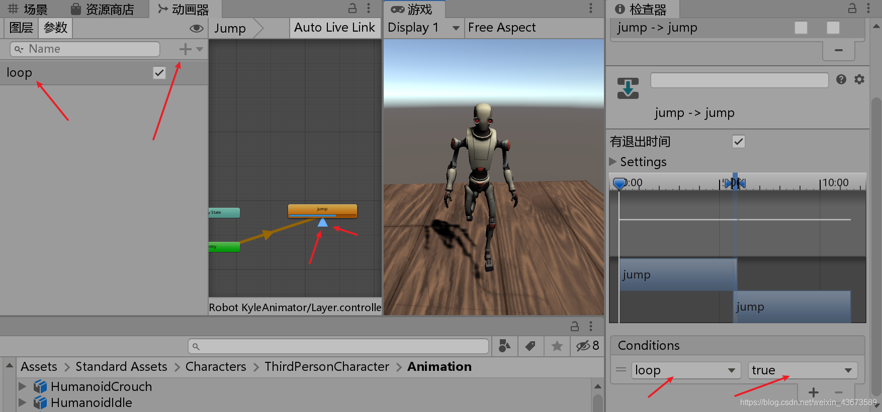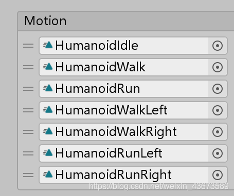 using System.Collections; using System.Collections.Generic; using UnityEngine; using UnityStandardAssets.CrossPlatformInput;//跨平台输入 [RequireComponent(typeof(Animator))]//强制绑定安妮梅特组件,如果这个对象没有,那么就自动添加上 public class BlendTree : MonoBehaviour { Animator anim; // Start is called before the first frame update void Start() { anim = GetComponent<Animator>(); } // Update is called once per frame void Update() { float h = CrossPlatformInputManager.GetAxis("Horizontal"); float v = CrossPlatformInputManager.GetAxis("Vertical"); Vector3 moveDirection = h * Vector3.right + v * Vector3.forward;//获取运动方向矢量 if(Input.GetKey(KeyCode.LeftShift)) { moveDirection.z *= 0.5f; } float turn = moveDirection.x; float forward = moveDirection.z; anim.SetFloat("speed", forward, 0.1f, Time.deltaTime); anim.SetFloat("turn", turn, 0.1f, Time.deltaTime); } }效果