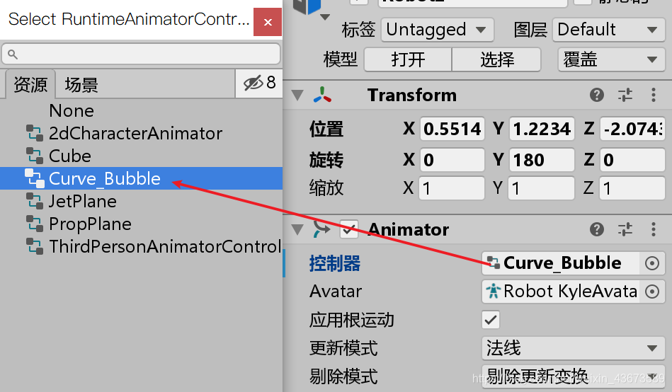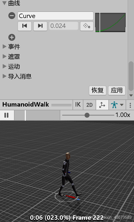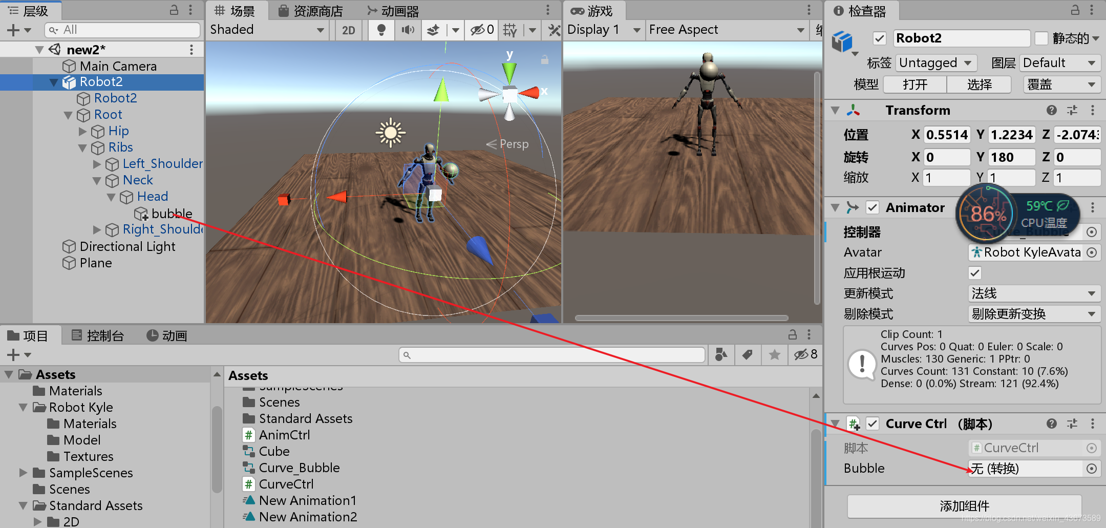 using System.Collections; using System.Collections.Generic; using UnityEngine; public class CurveCtrl : MonoBehaviour { public Transform bubble;//公开应该对象,待会设置成bubble Vector3 originalScale;//设定初始泡泡大小 // Start is called before the first frame update void Start() { originalScale = bubble.localScale; } // Update is called once per frame void Update() { float curve = GetComponent<Animator>().GetFloat("CurveValue");//通过调用安妮梅特组件的GetFloat函数来获取值,来修改泡泡的大小 bubble.localScale = new Vector3(originalScale.x * curve, originalScale.y * curve, originalScale.z * curve);//根据走路节奏调整泡泡大小,让其或大或小 } }把脚本绑定到人上,然后记得指定那个泡泡