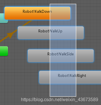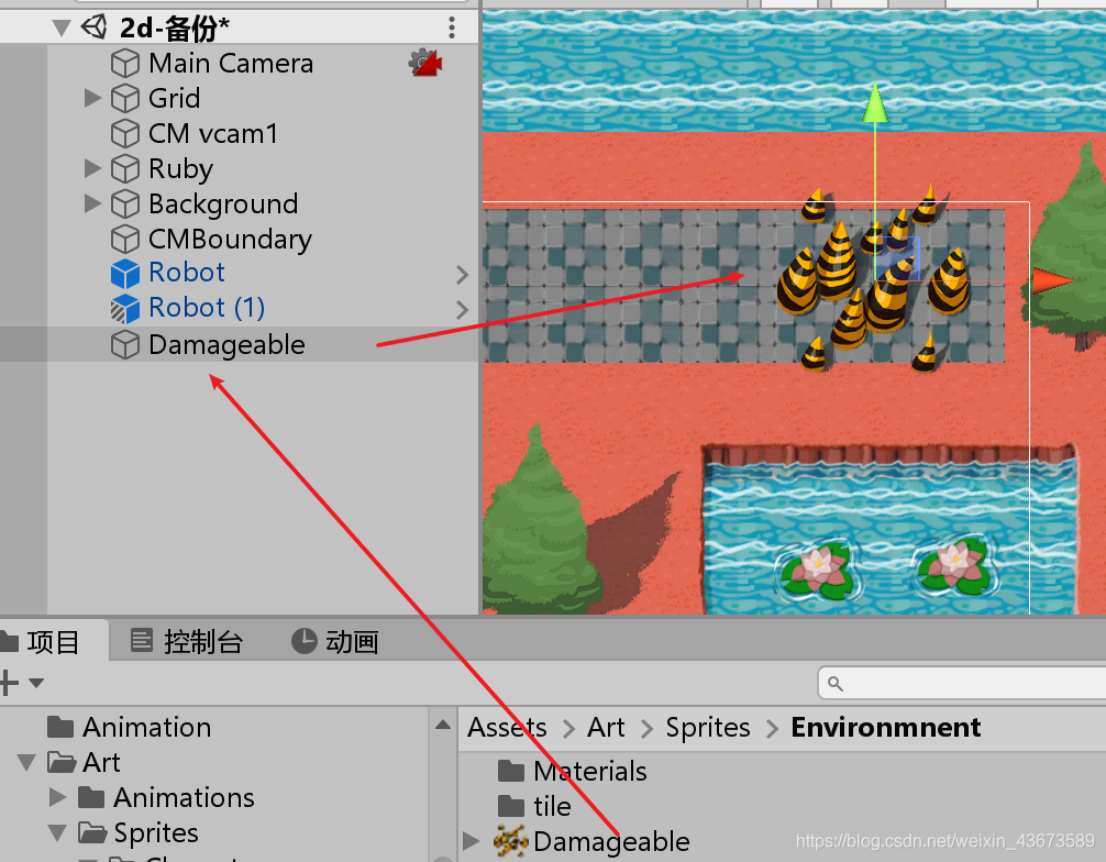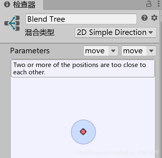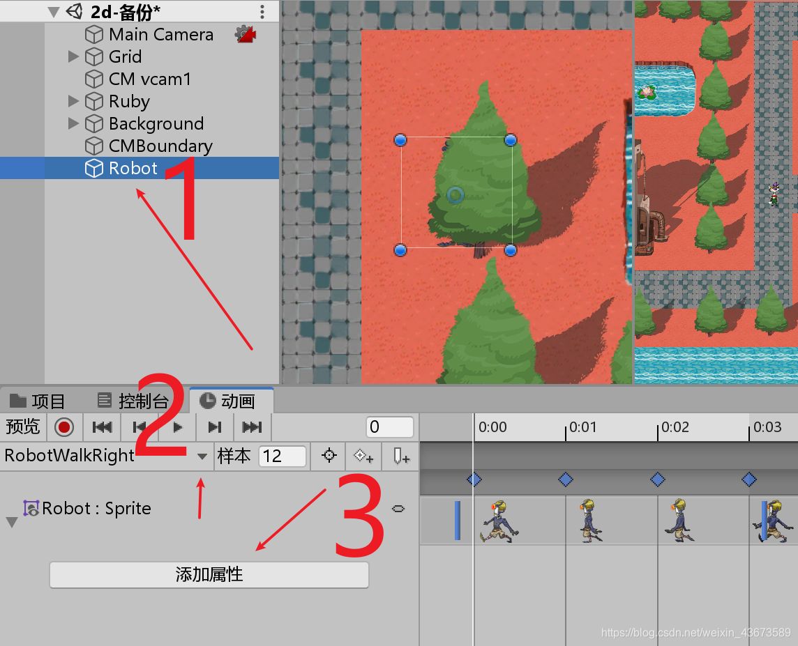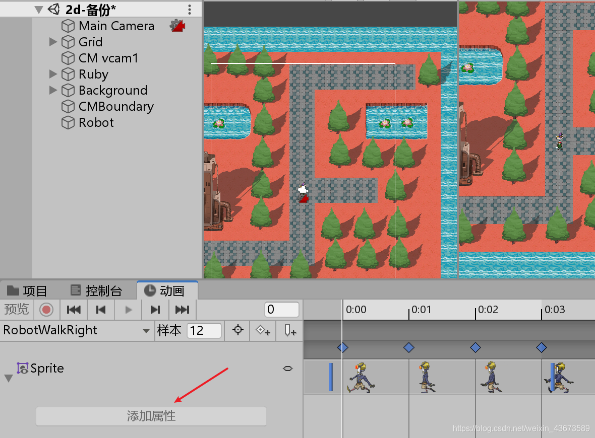 using System.Collections; using System.Collections.Generic; using UnityEngine; using UnityEngine.EventSystems; public class RobotControl : MonoBehaviour { public float speed = 3f;//机器人要运动肯定要有一个速度 Animator anim;//创建一个动画状态集的变量,用来设定动画状态集的值,利用Animator参数,要决定到底播放左边的动画还是右边的动画 Rigidbody2D rbody;//为了防止角色抖动,用刚体的moveposition来确定位置 public bool isVertical;//设定一个参数,判断是水平移动还是垂直移动 Vector2 moveDirection;//设定一个运动方向的变量 float changeTimer;//设定一个计时器,每过一段时间,机器人换一个方向运动 public float changeDirectionTime = 2f;//计时器长度 // Start is called before the first frame update void Start() { anim = GetComponent<Animator>();//获取动画组件,一会儿要修改它的参数 rbody = GetComponent<Rigidbody2D>();//获取2d刚体,一会儿要修改它的位置 moveDirection = isVertical ? Vector2.up : Vector2.right;//初始状态下判断运动方向 changeTimer = changeDirectionTime;//计时器初始化 } // Update is called once per frame void Update() { changeTimer -= Time.deltaTime;//计时器每一帧都减小 if(changeTimer<0) { moveDirection *= -1;//如果小于0,改变方向 changeTimer = changeDirectionTime;//改变方向后计时器重新初始化 } Vector2 position = rbody.position;//定义一个二维向量位置坐标来获取刚体坐标 position.x += moveDirection.x * speed * Time.deltaTime;//改变水平方向位置 position.y += moveDirection.y * speed * Time.deltaTime;//改变垂直方向位置 rbody.MovePosition(position);//为了防止抖动,调用刚体的moveposition,里面是二维向量的位置 //设定动画状态集的参数,把moveDirection的值传递给move X/Y anim.SetFloat("move X", moveDirection.x); anim.SetFloat("move Y", moveDirection.y); } }脚本编辑好之后绑定到角色上面