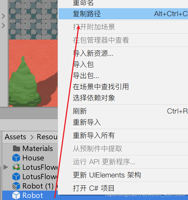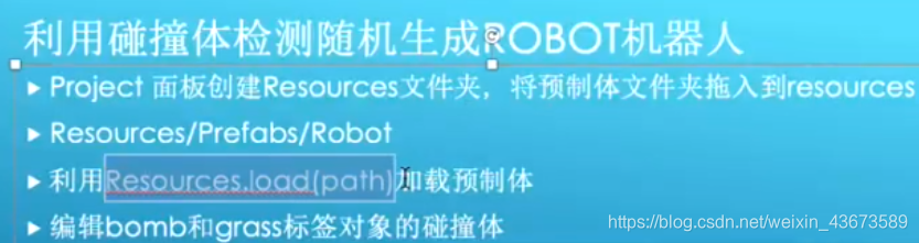 预制体路径 Assets / Resources / Prefabs / Robot.prefab robotObj=Instantiate(Resources.Load(""))//加载资源用预制体克隆一个对象 >>删去不必要的路径 robotObj = Instantiate(Resources.Load("Assets / Resources / Prefabs / Robot.prefab")); >> robotObj = Instantiate(Resources.Load("Prefabs / Robot")); >>填写其他参数,如随机生成的位置,还有方向,去掉空格 robotObj = Instantiate(Resources.Load("Prefabs/Robot"),position_robot,Quaternion.identity)as GameObject;若路径不对会有如下报错