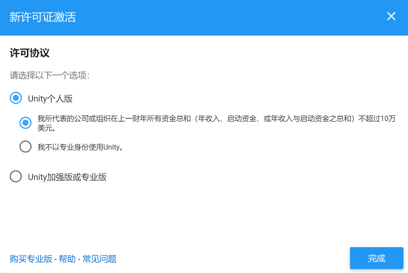 申请免费使用的许可证(需要经常手动申请,保持许可证有效,不然Unity会报错)