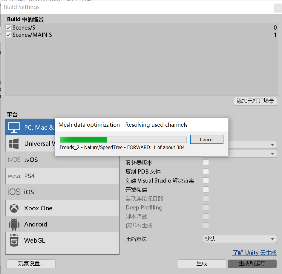在生成设置中,将两个场景依次添加,然后生成