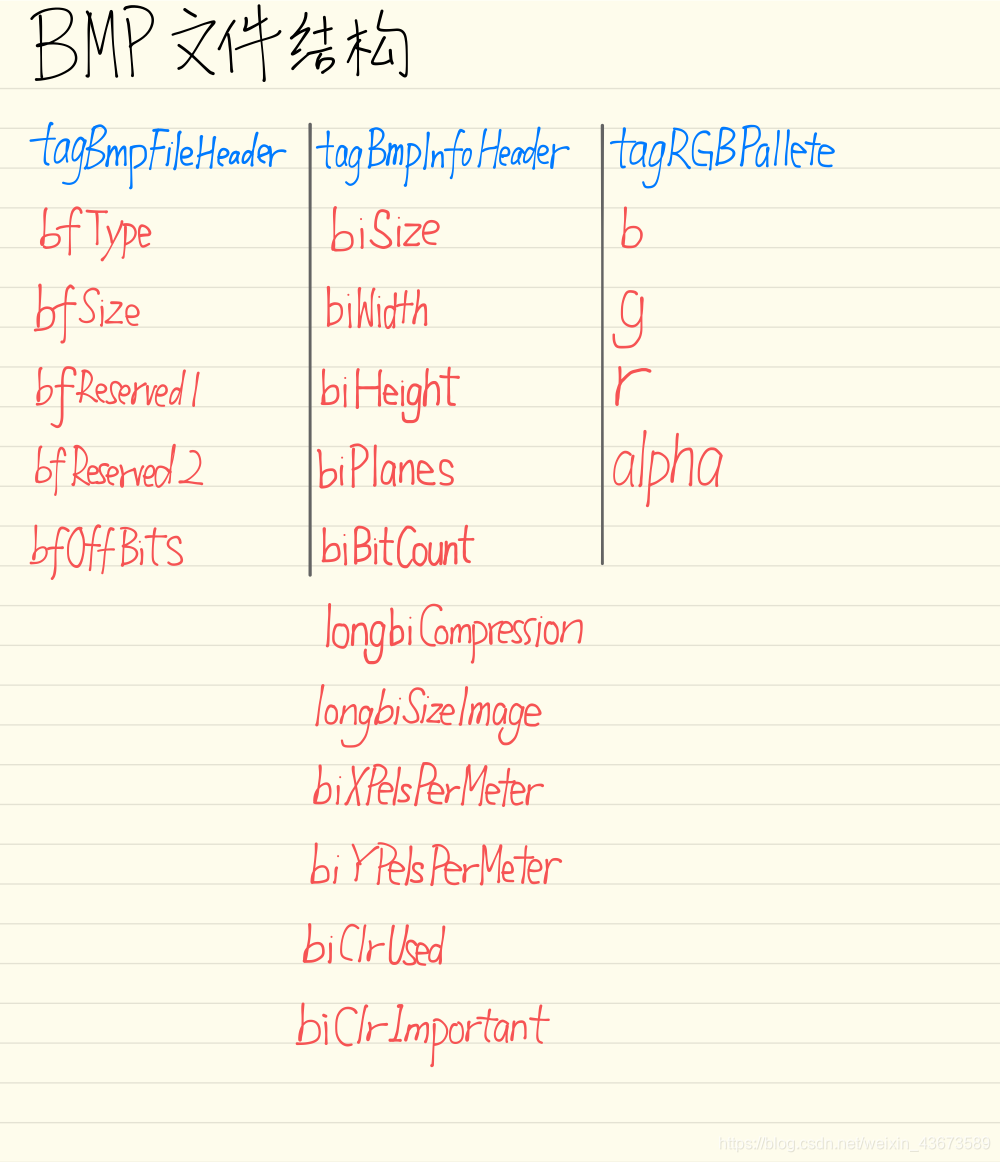 BMP图像文件被分成4个部分:位图文件头(Bitmap File Header)、位图信息头(Bitmap Info Header)、颜色表(Color Map)和位图数据(即图像数据,Data Bits或Data Body)。
