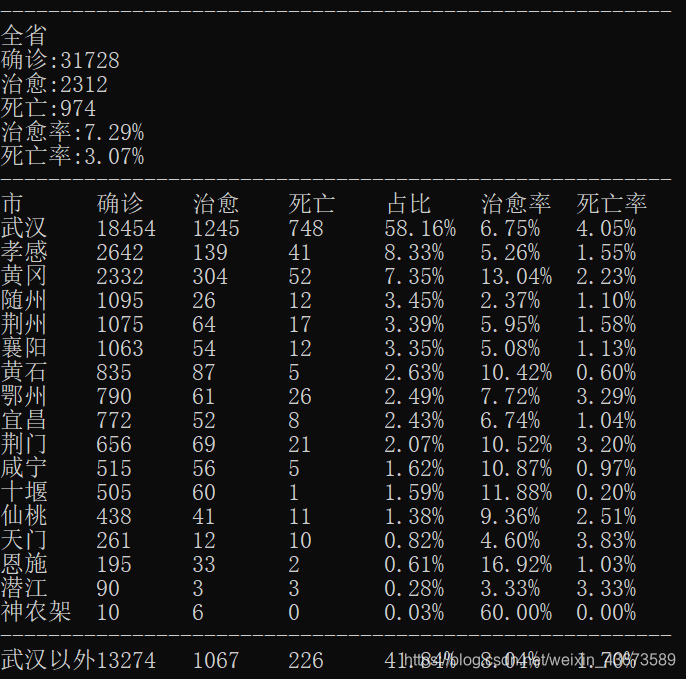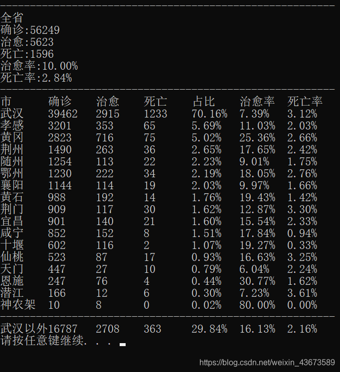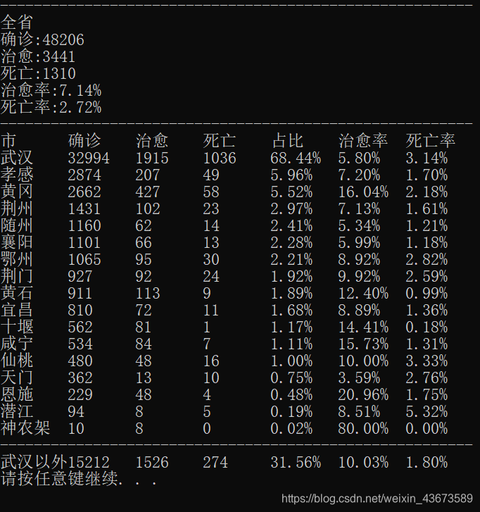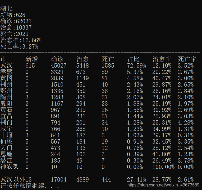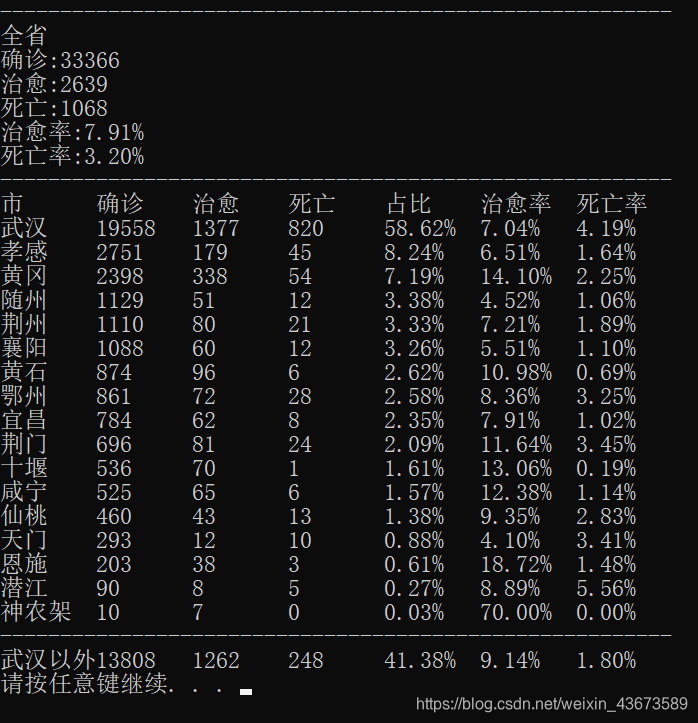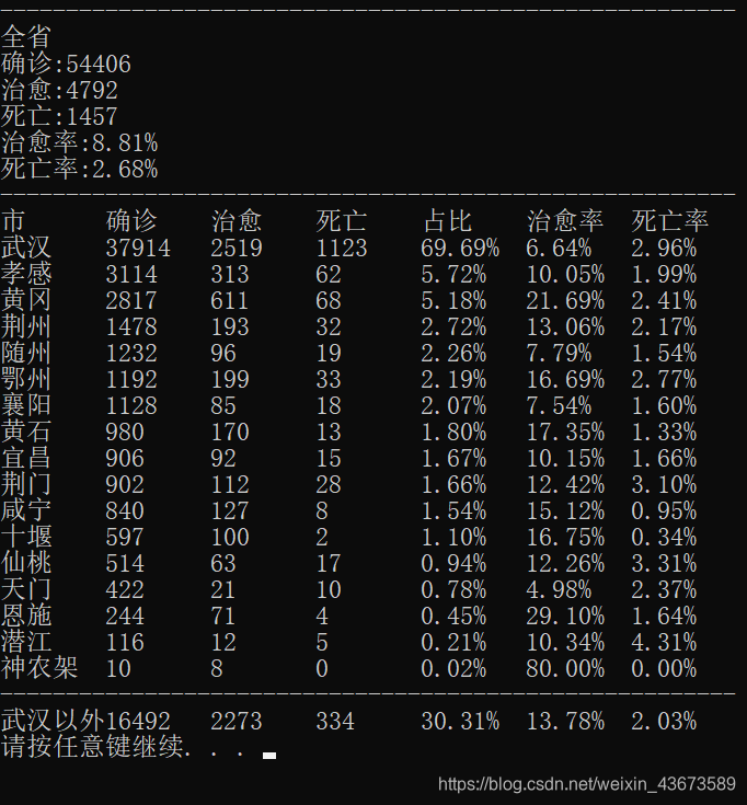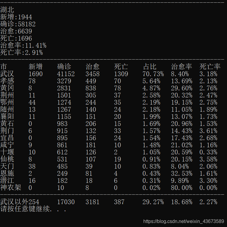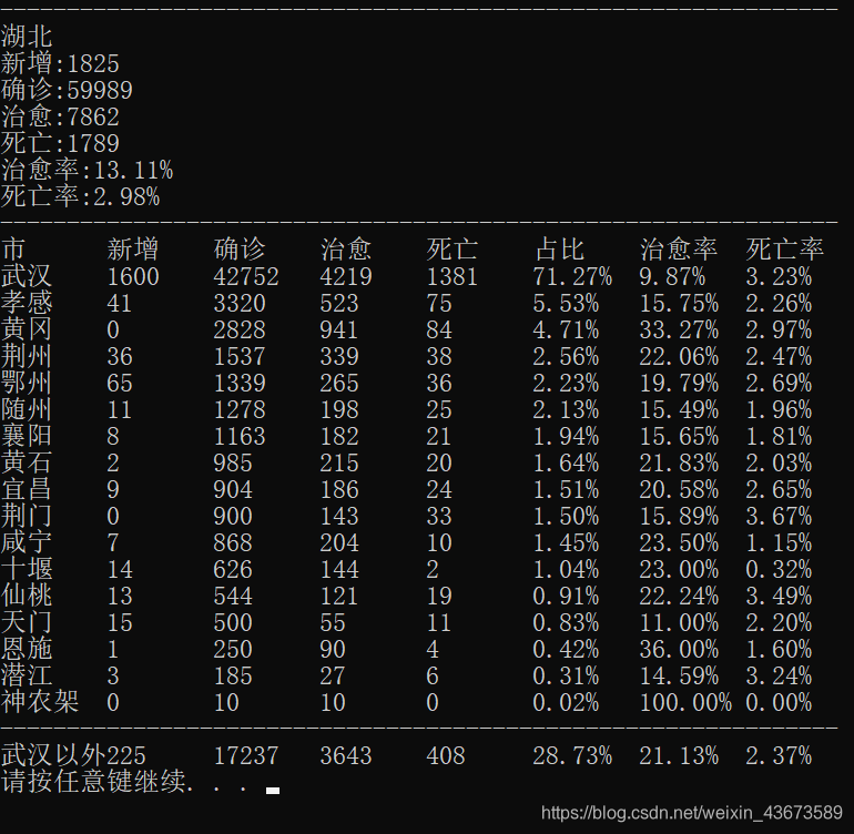 cout<<"湖北\n新增:"<<total3<<"\n确诊:"<<total<<"\n治愈:"<<total1<<"\n死亡:"<<total2<<"\n治愈率:"<<setiosflags(ios::fixed)<<setprecision(2)<<(double)total1/total*100<<"%"<<"\n死亡率:"<<(double)total2/total*100<<"%"<<endl;