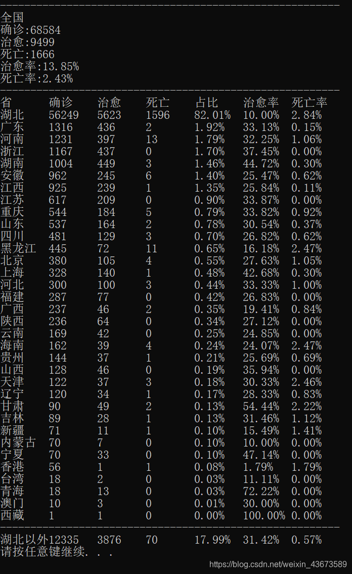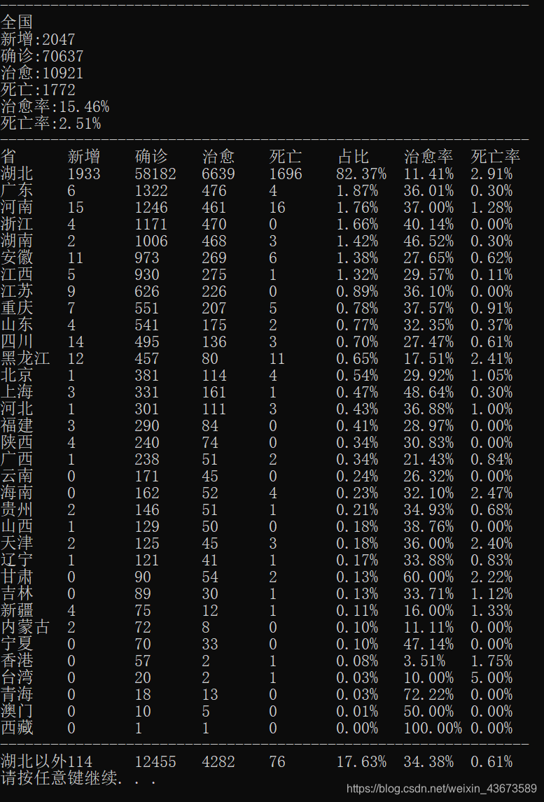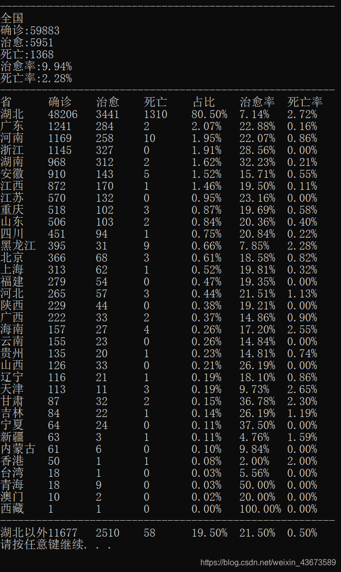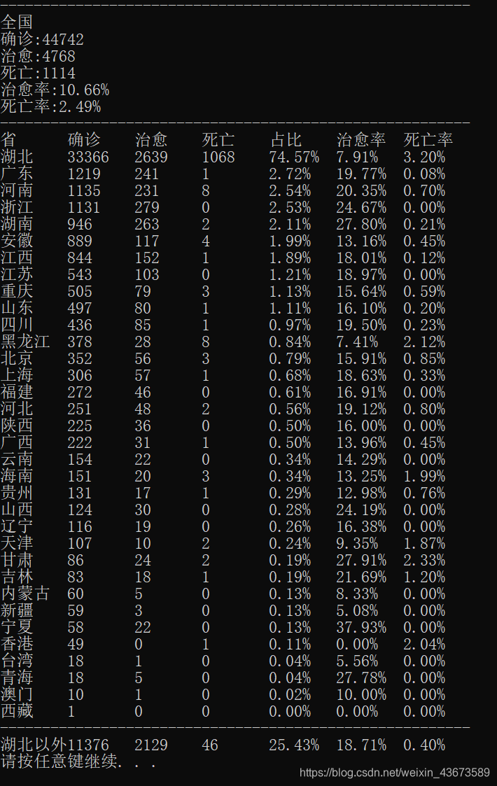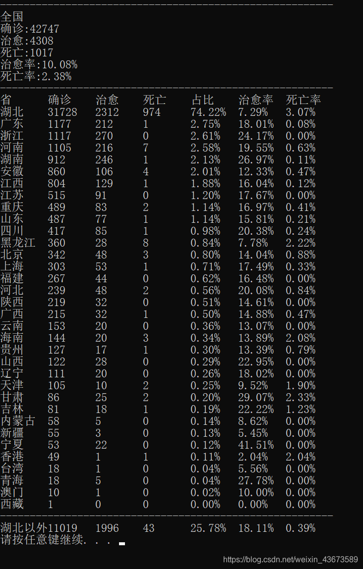 cout<<"湖北\n新增:"<<total3<<"\n确诊:"<<total<<"\n治愈:"<<total1<<"\n死亡:"<<total2<<"\n治愈率:"<<setiosflags(ios::fixed)<<setprecision(2)<<(double)total1/total*100<<"%"<<"\n死亡率:"<<(double)total2/total*100<<"%"<<endl;