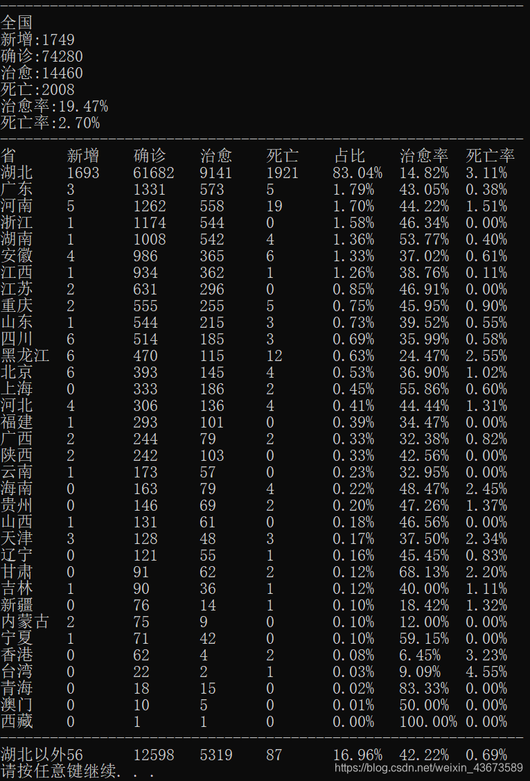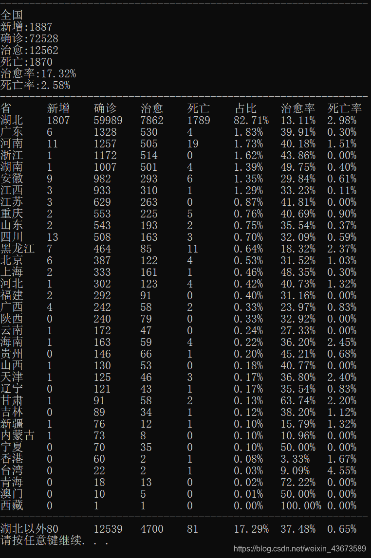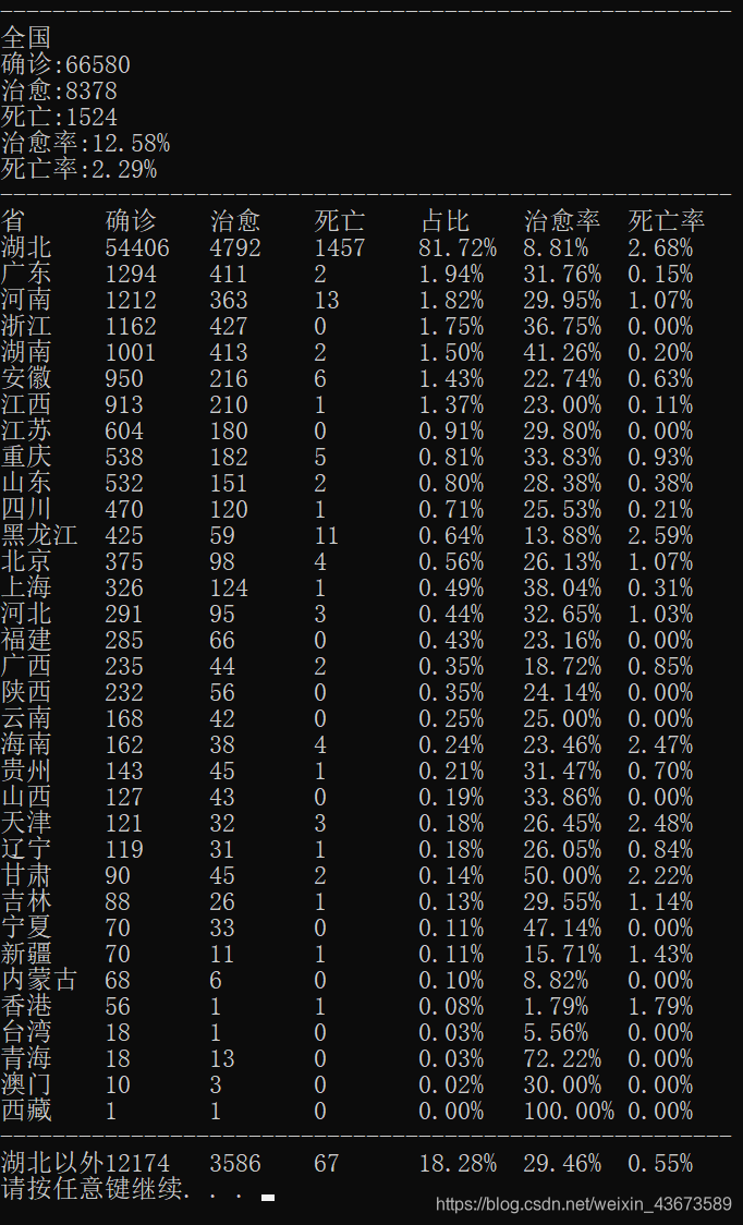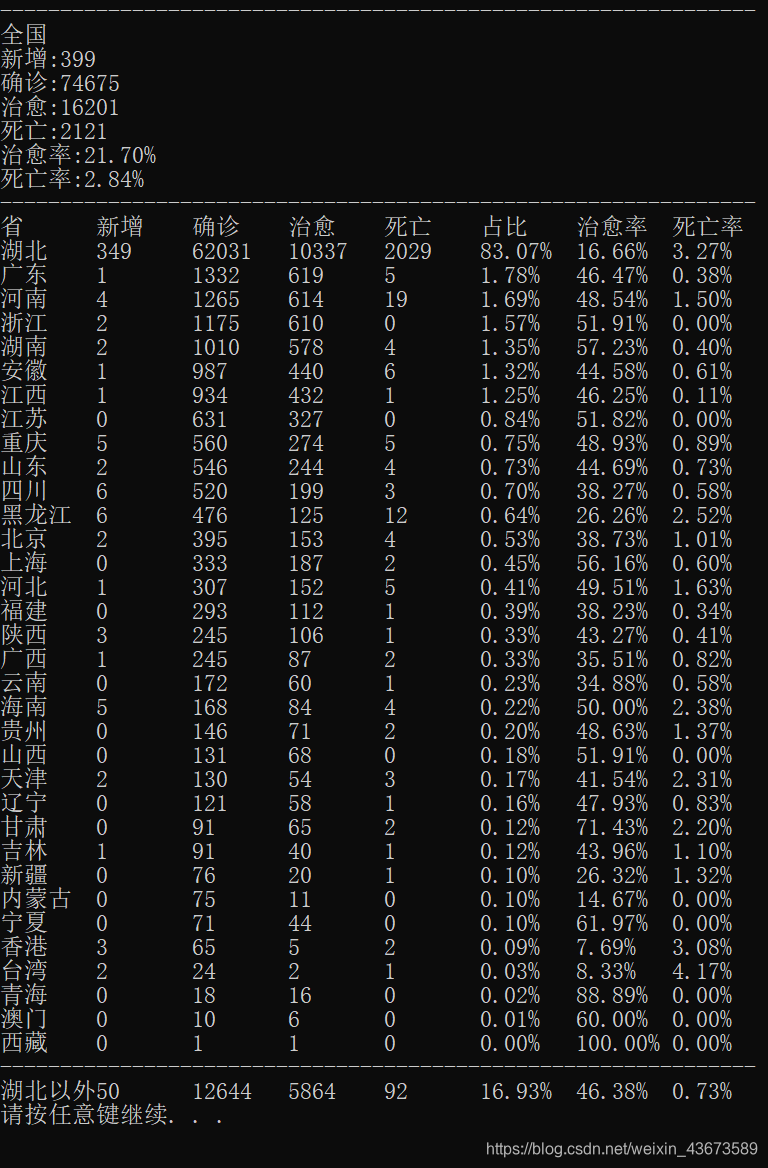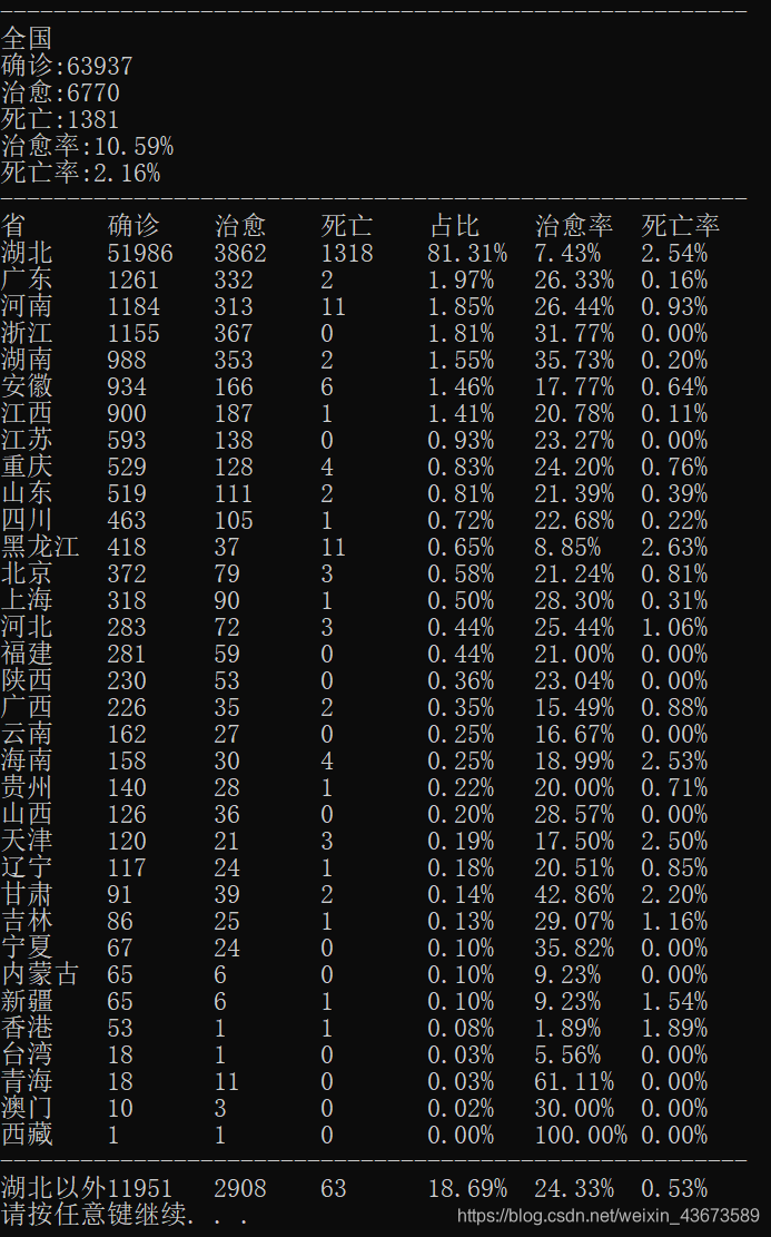 cout<<"湖北\n新增:"<<total3<<"\n确诊:"<<total<<"\n治愈:"<<total1<<"\n死亡:"<<total2<<"\n治愈率:"<<setiosflags(ios::fixed)<<setprecision(2)<<(double)total1/total*100<<"%"<<"\n死亡率:"<<(double)total2/total*100<<"%"<<endl;