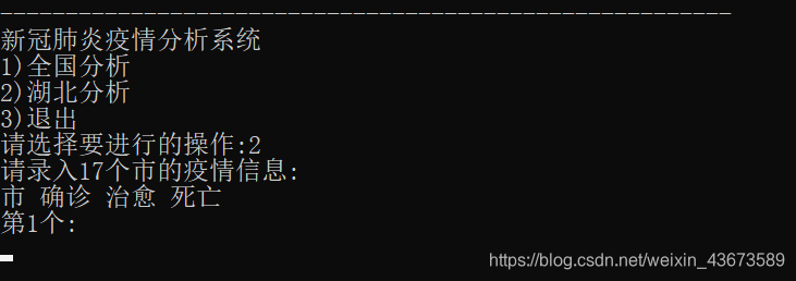 cout<<"新冠肺炎疫情分析系统\n1)全国分析\n2)湖北分析\n3)退出\n请选择要进行的操作:";