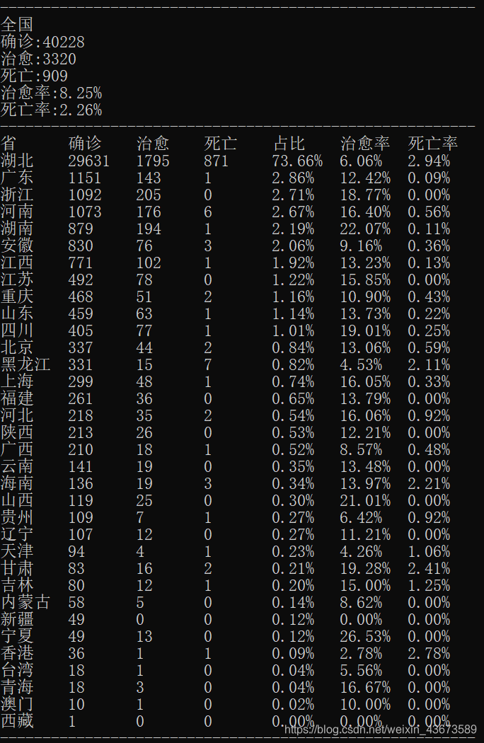 cout<<"省\t新增\t确诊\t治愈\t死亡\t占比\t治愈率\t死亡率"<<endl;