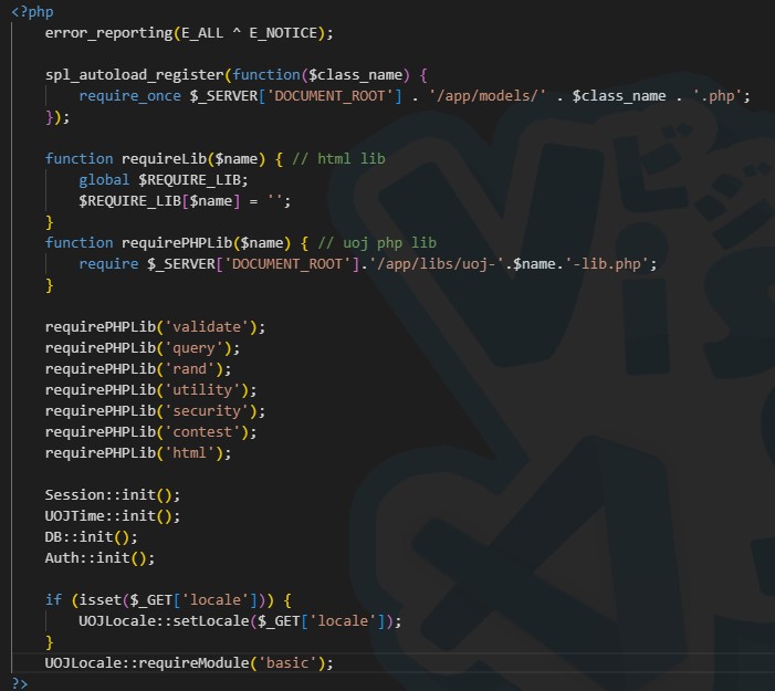 validate:验证lib,用来验证某些信息是否合法,比如账号密码等query:查询lib,用来调用后台数据库查询相关信息,结合model文件夹下的DB.php类使用rand:随机lib,用来生成随机数据(随机数、随机文件名等)utility:utility—lib,用来实现一些在web上的功能,比如配置合并,字符串处理等security:安全lib,用来维护账号的安全,比如密码处理,token等contest:比赛lib,用来处理比赛相关的方法集,比如计算rating,更新人数等html:HTMLlib,用来接收网页相关信息、输出html代码等