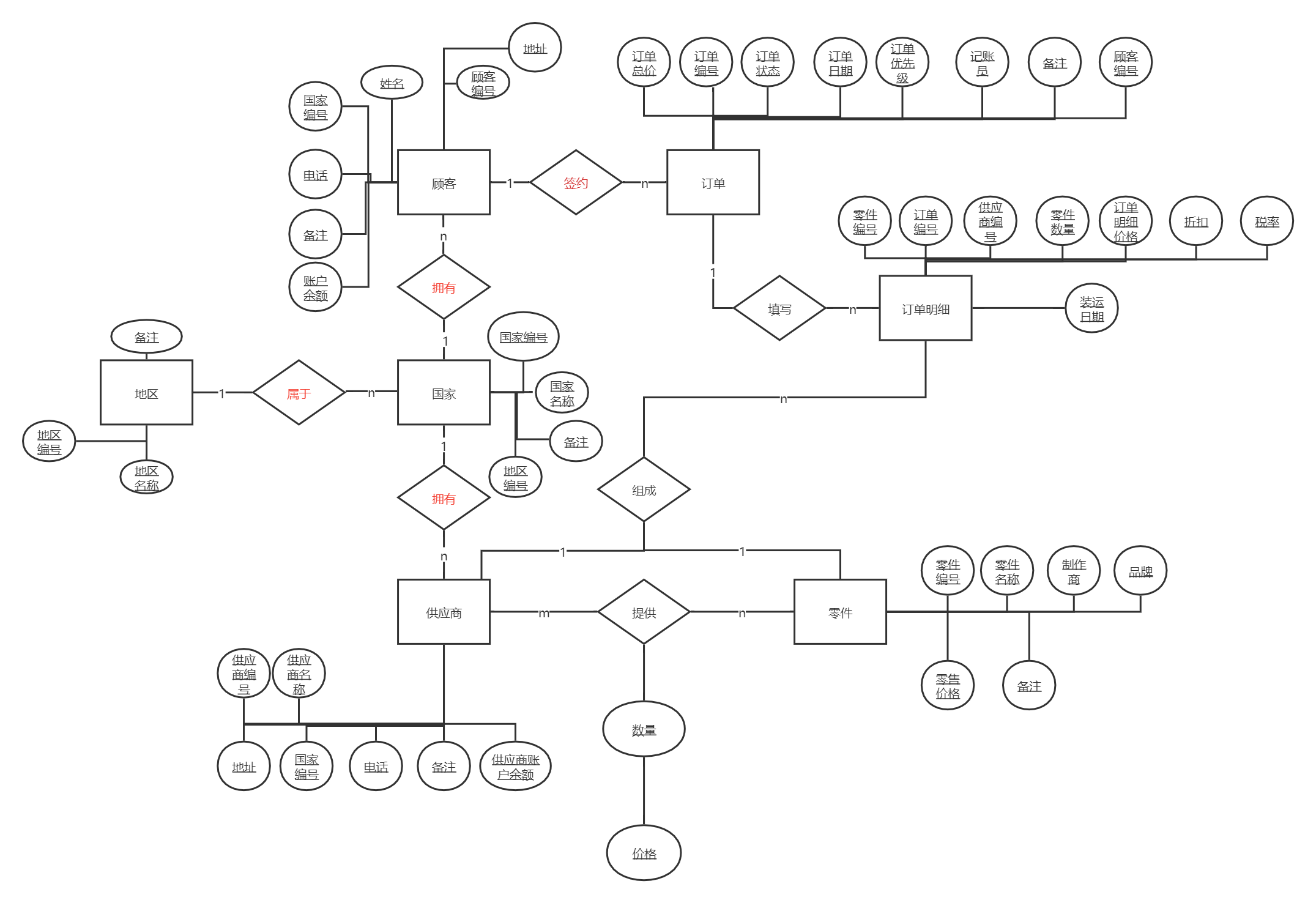其中,一个供应商可以供应多种零件,一个零件也可以有多个供应商。一个客户订单可以订购多种供应商供应的零件。客户和供应商都分属不同的国家,而国家按世界五大洲八大洋划分地区。