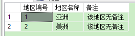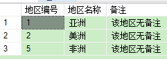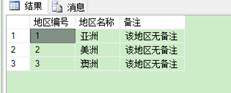 insert into 地区表(地区编号,地区名称)values(1,'亚洲'); insert into 地区表(地区编号,地区名称)values(2,'美洲'); insert into 地区表(地区编号,地区名称)values(3,'澳洲'); select* from 地区表;