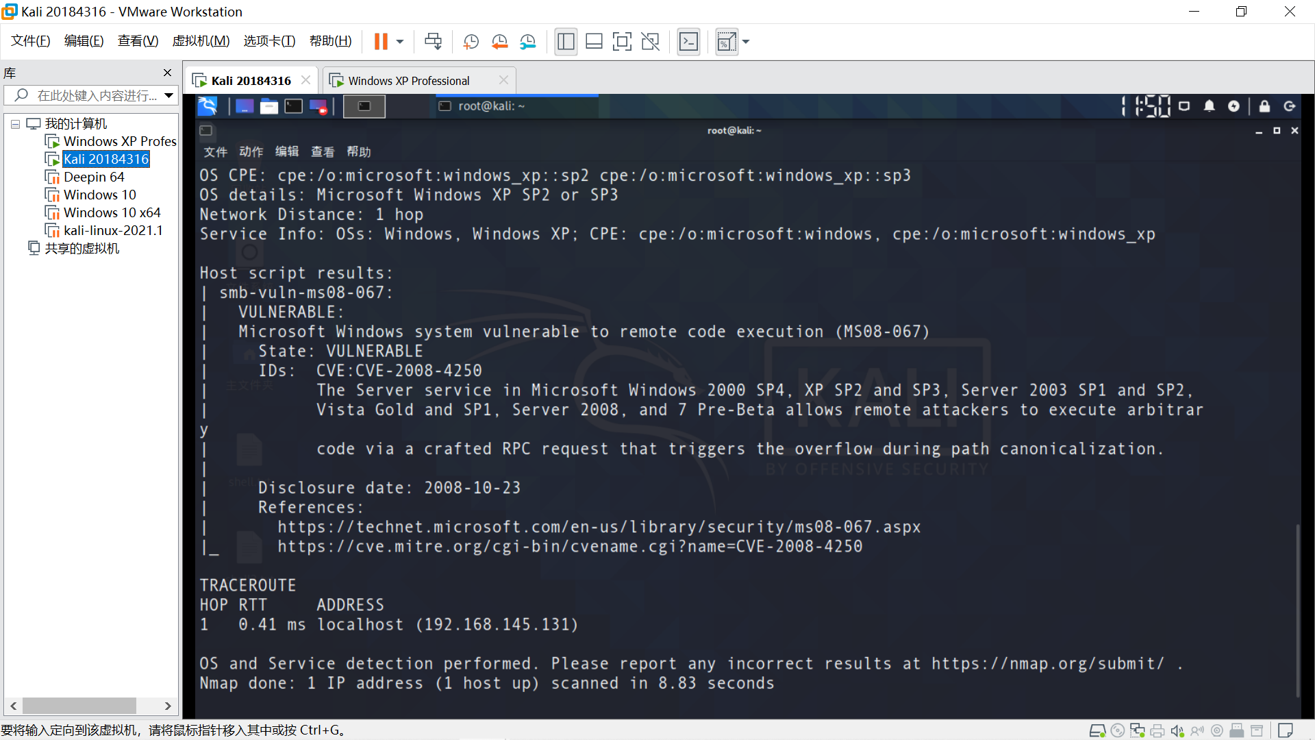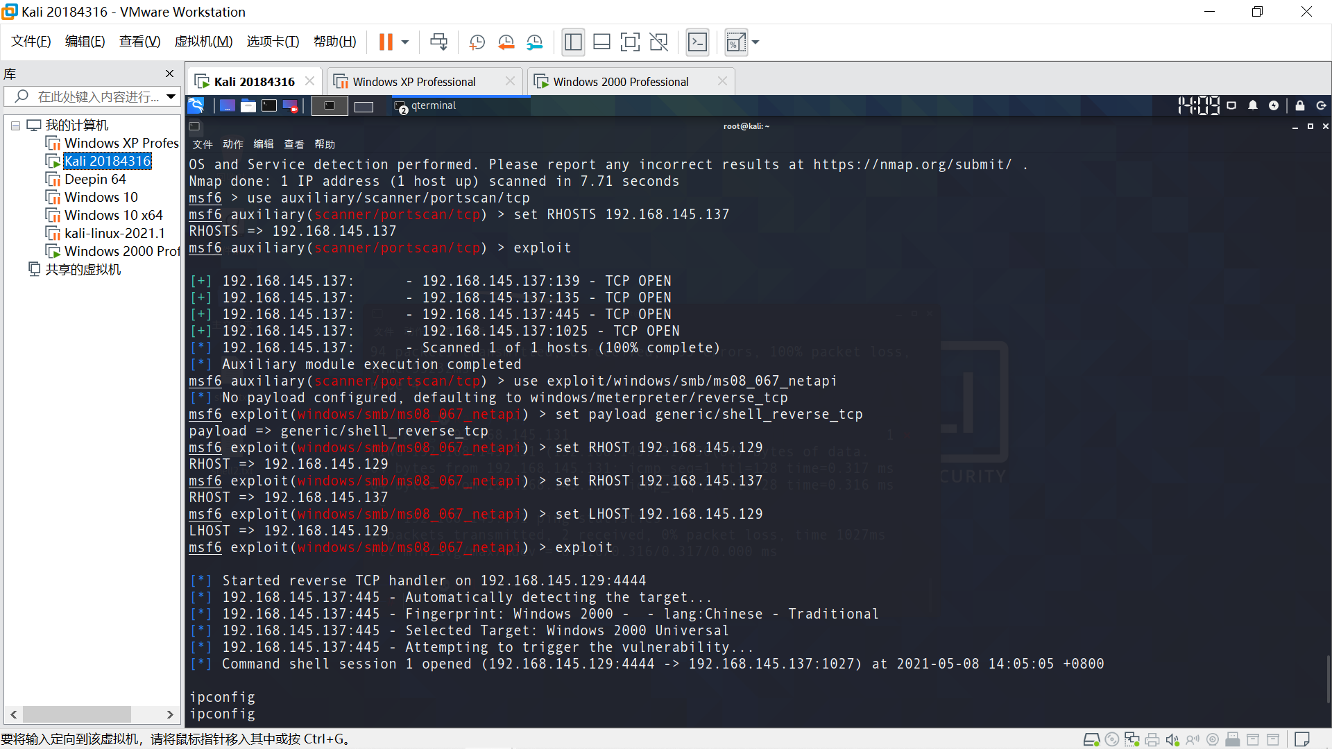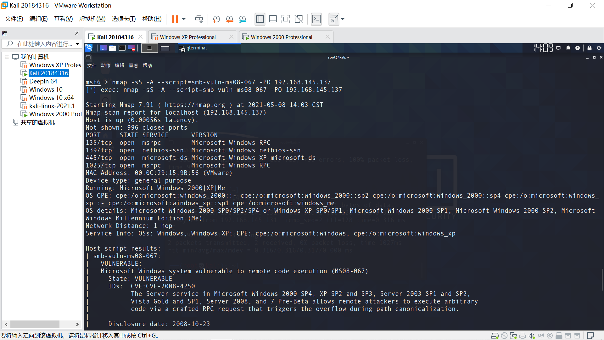 目标最近Windows XP,确保能相互ping通。