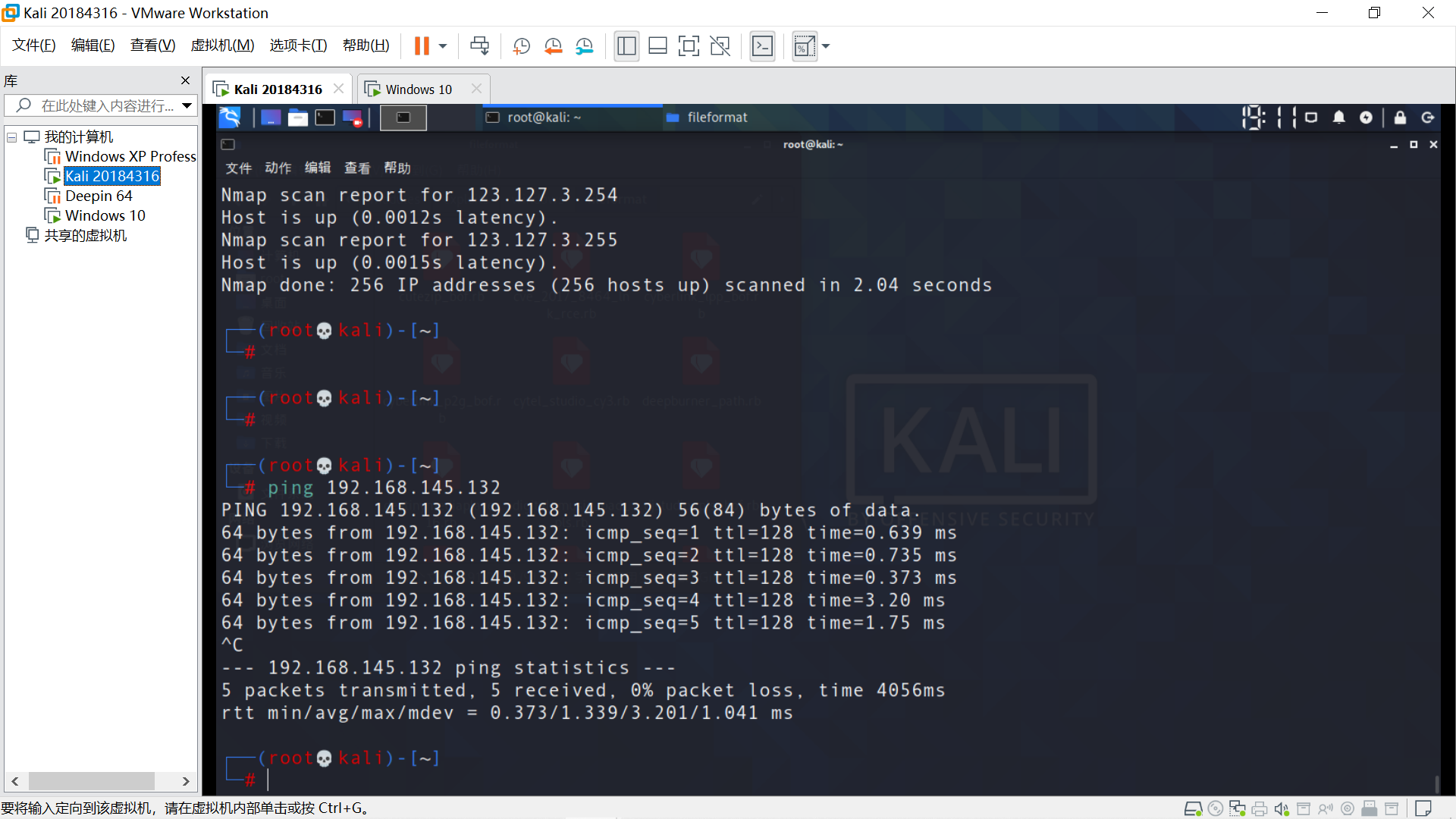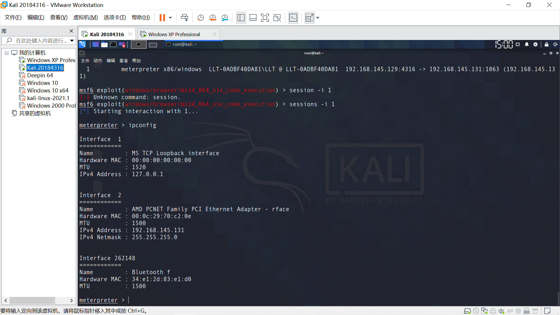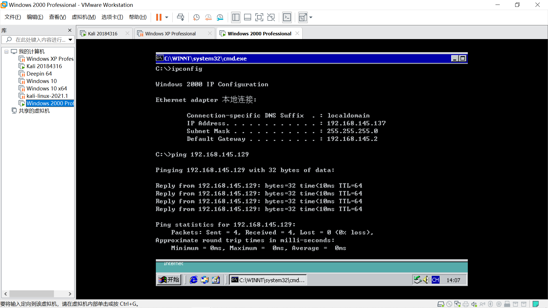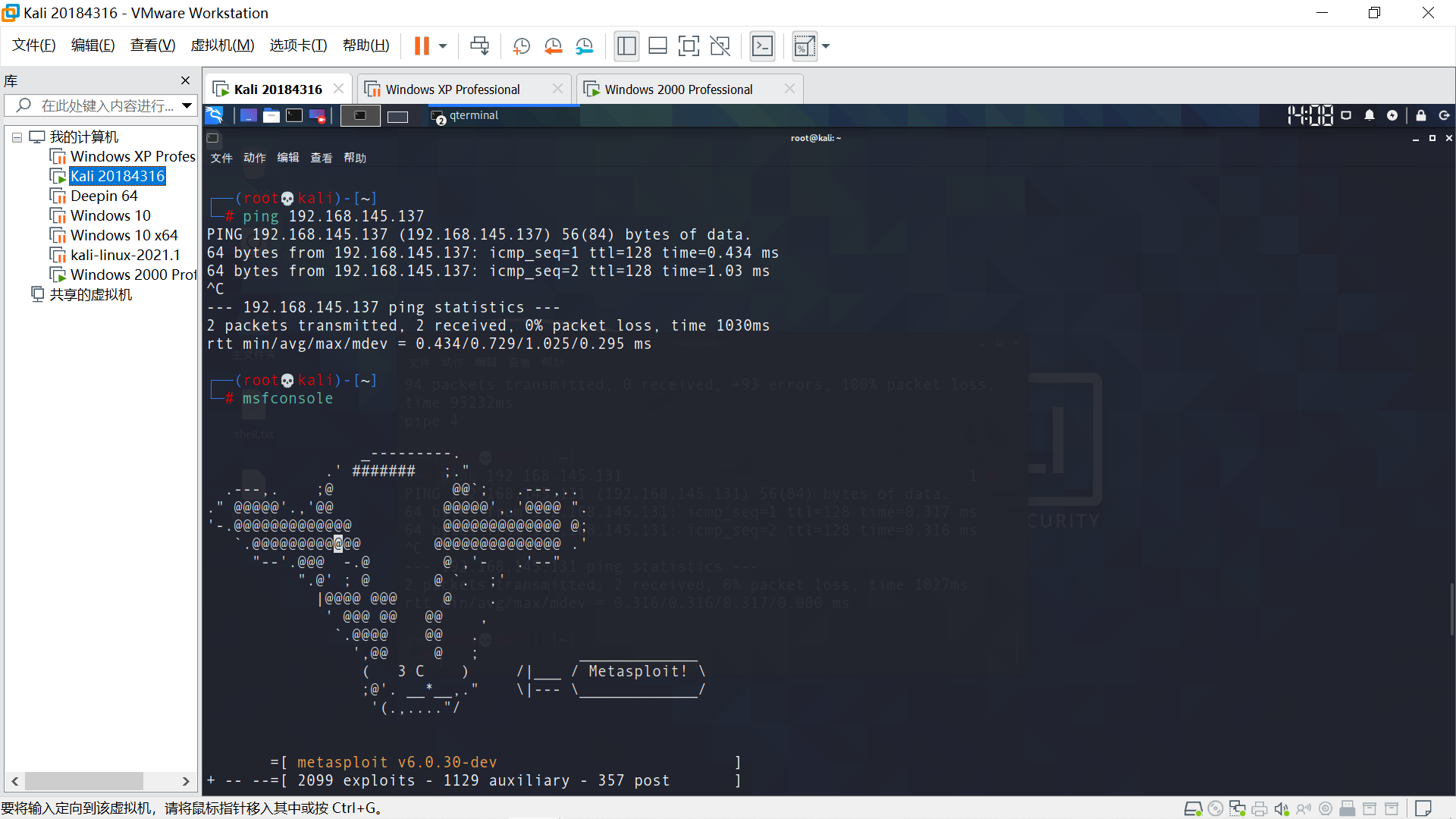 目标最近Windows XP,确保能相互ping通。