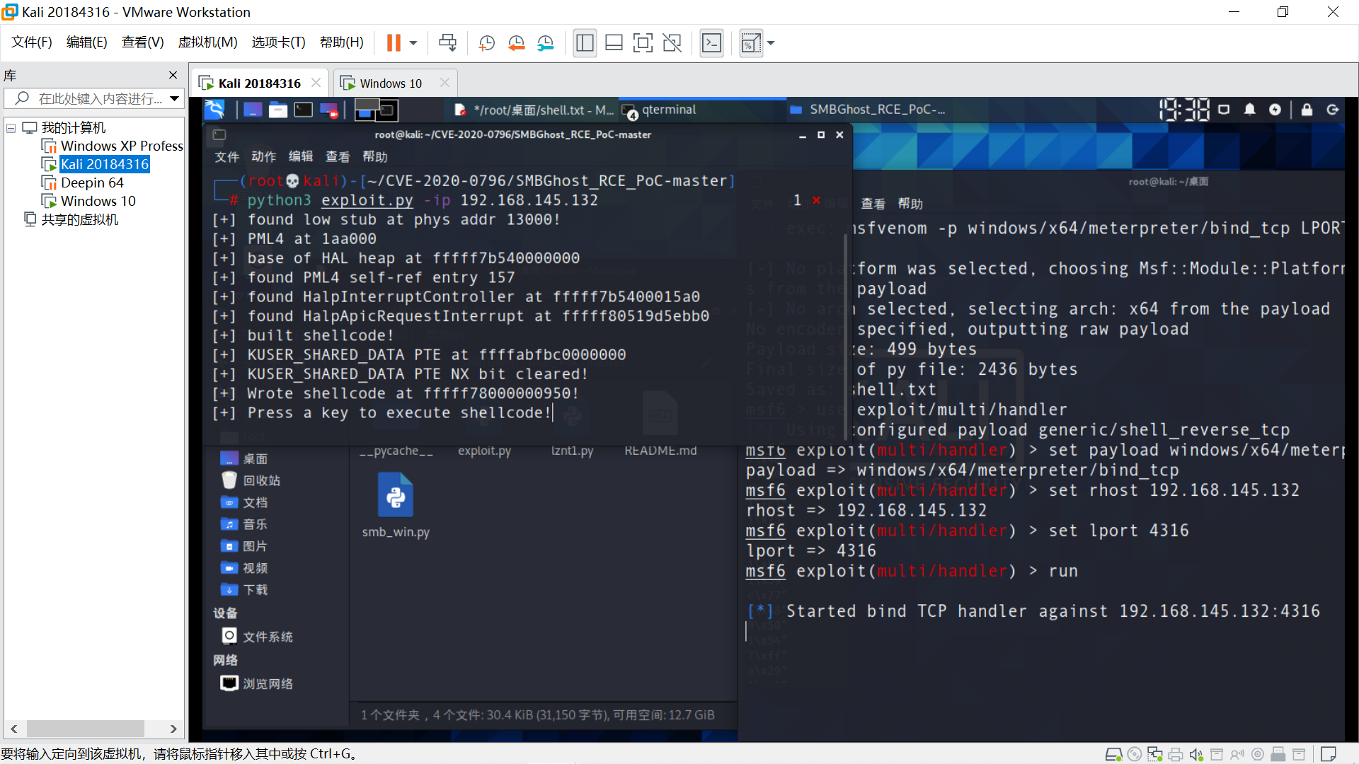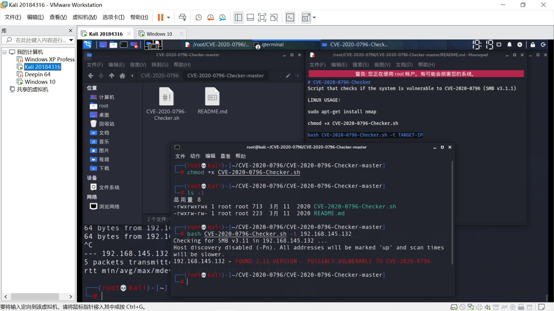 在Linux端,扫描漏洞是否存在 bash CVE-2020-0796-Checker.sh -t 192.168.145.132