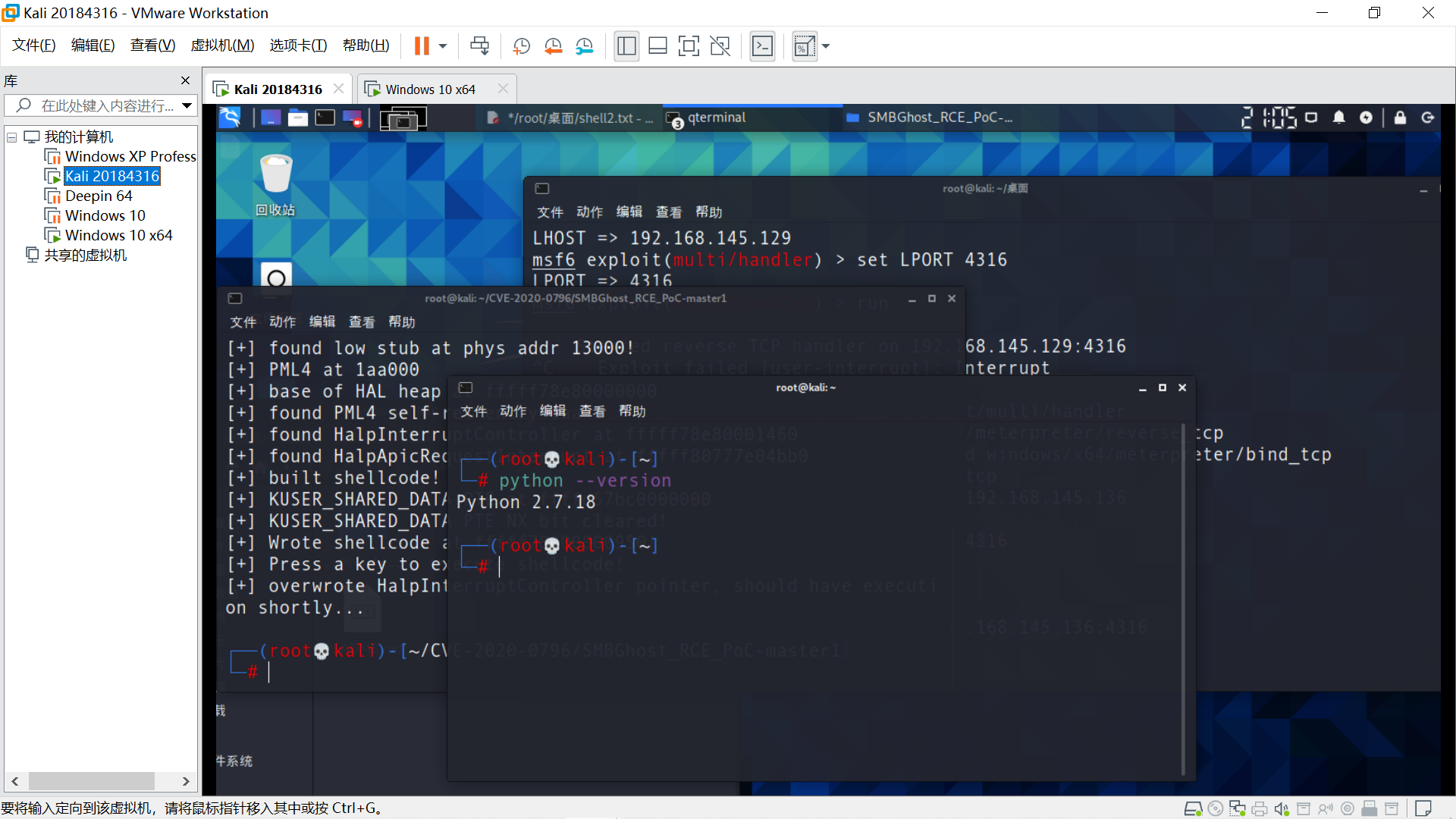 更换Python版本,执行攻击,靶机蓝屏,获取Shell失败。参考博客如下。
