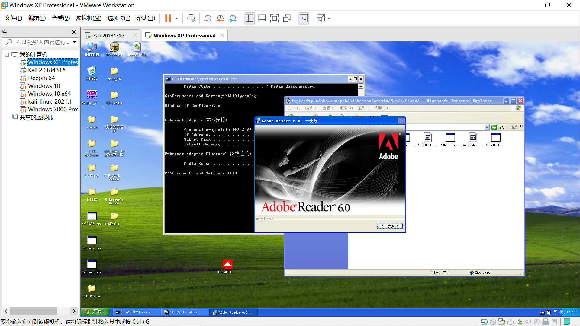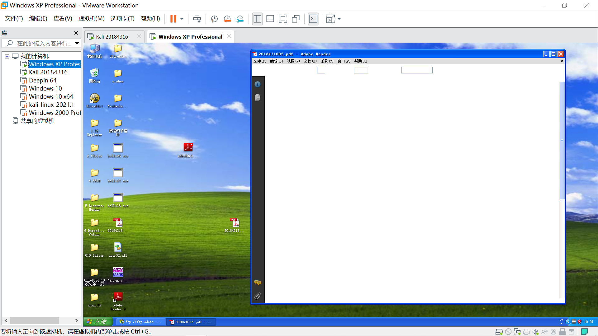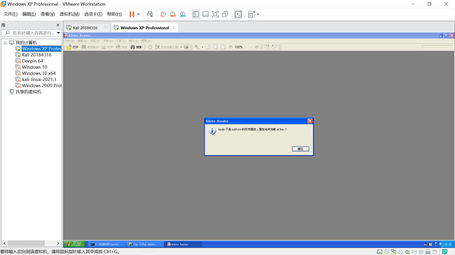 在Windows XP端,用Adobe Reader打开20184316.pdf,软件报错,回连失败。
