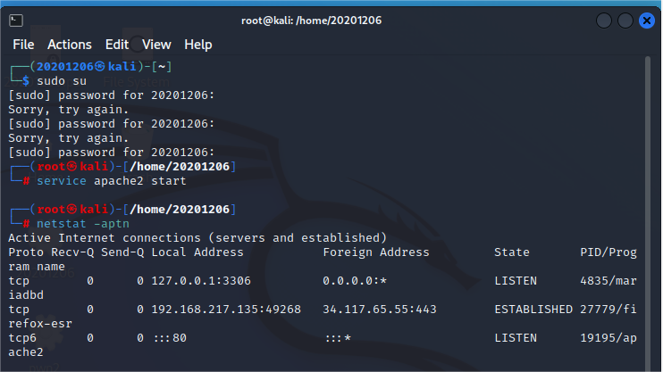 输入netstat -aptn查看端口信息,如果80端口被Apache2监听,则启动成功。