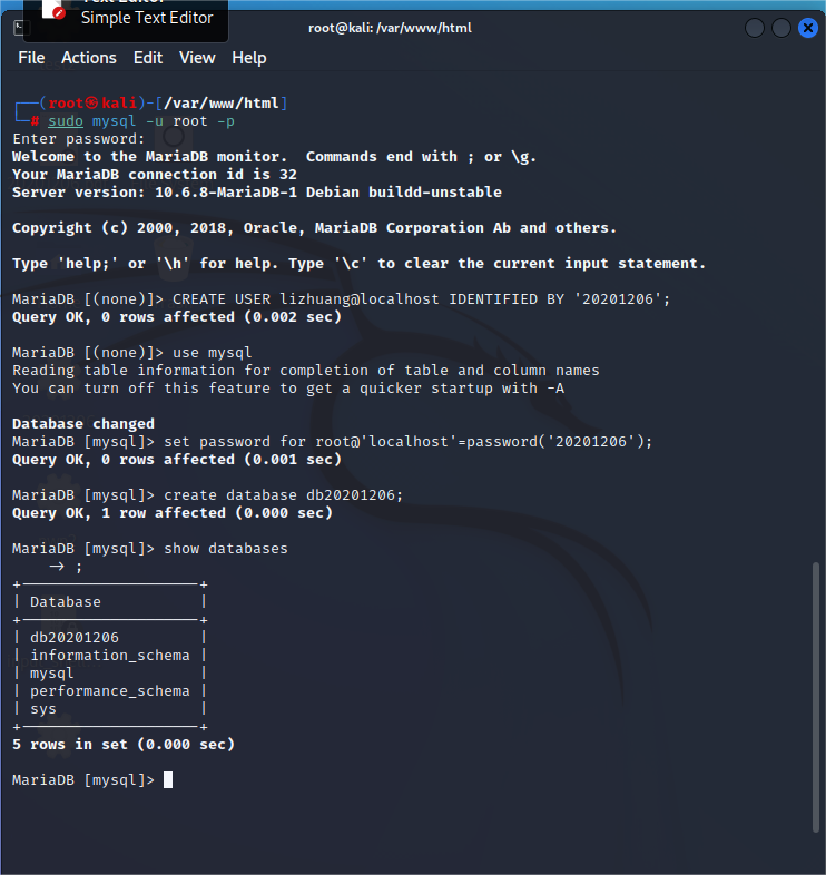 root@'localhost'=password('20201206');//修改密码