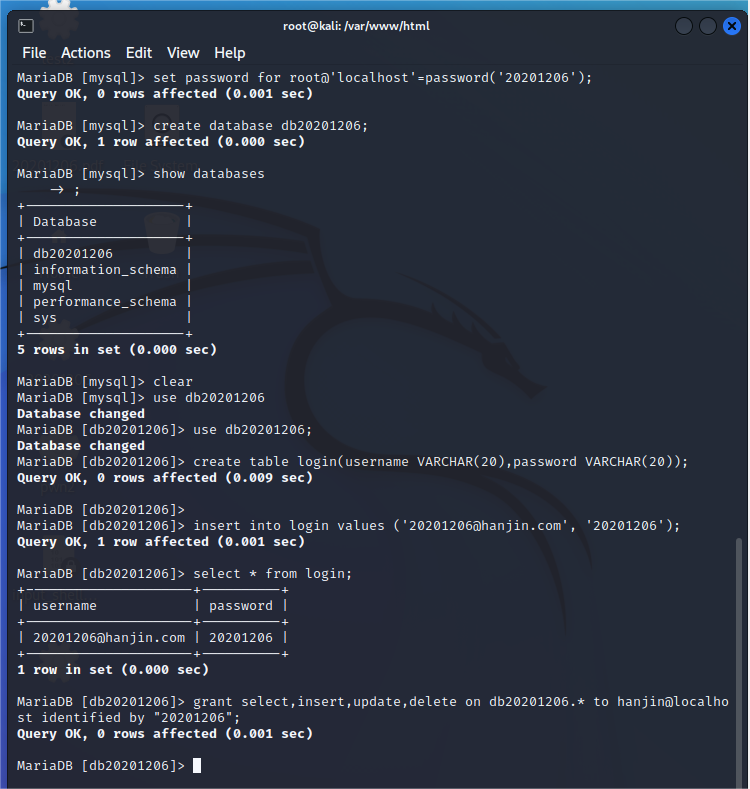 grant select,insert,update,delete on db20201206.* to hanjin@localhost identified by "20201206";//添加用户并授予权限