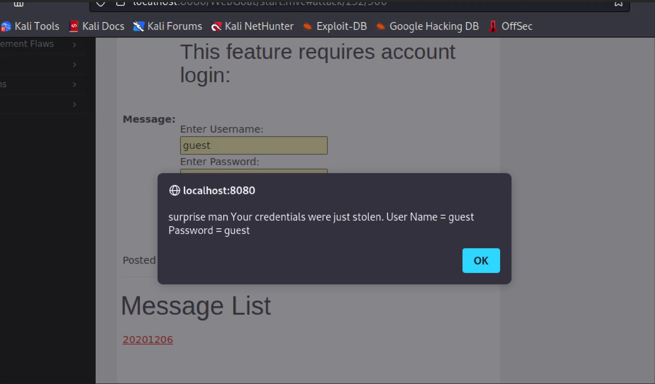 alert("surprise man Your credentials were just stolen. User Name = " + document.phish.user.value + " Password = " + document.phish.pass.value);