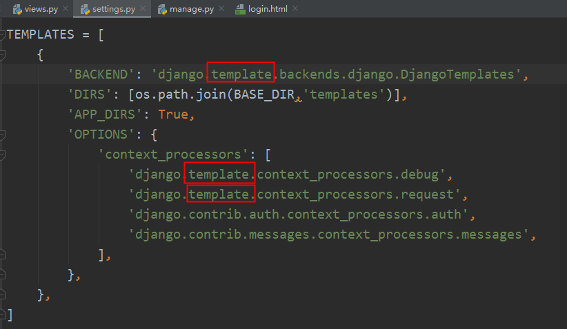 因为起错文件夹名templates,把“template”重命名到了“templates”,所以settings.py里的“template”也变成“templates”了,所以就出现了找不到django.templates的问题了。
