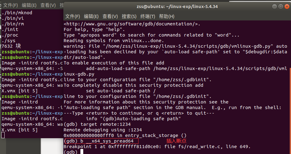 cd linux-5.4.34/ gdb vmlinux target remote:1234 b __x64_sys_pwrite64