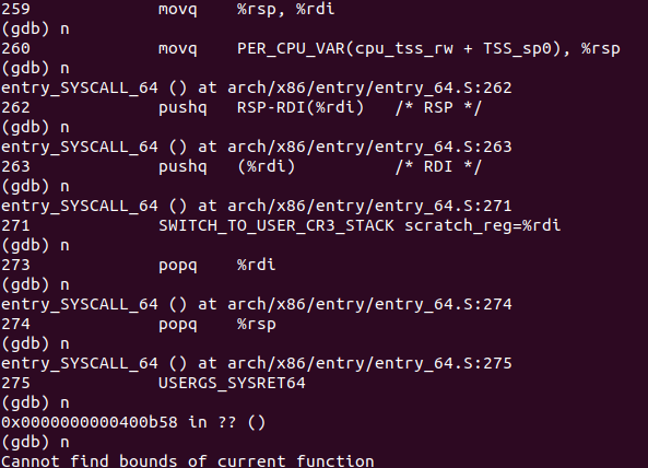 并准备跳回用户态。最后执行popq ,完成堆栈切换。