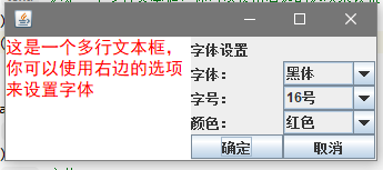 text = new JTextArea("这是一个多行文本框,你可以使用右边的选项来设置字体",3,15);