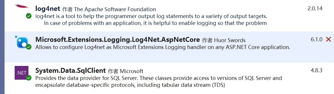 1、nuget添加log4net、Microsoft.Extensions.Logging.Log4Net.AspNetCore、System.Data.SqlClient三个引用