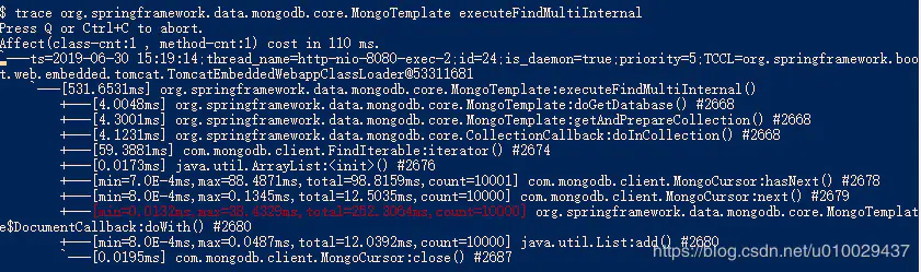 通过图示表明调用 MongoTemplate.executeFindMultiInternal() 方法时,最耗时的方法是在 doWith() 方法,总共执行 10000 次,耗时 ==252.3064ms==,最少一次调用耗时 ==0.0132ms==,最大一次耗时 ==38.4329ms==,分析原因还是在于数据量太大,MongoTemplate 通过循环遍历出结果在进行序列化。