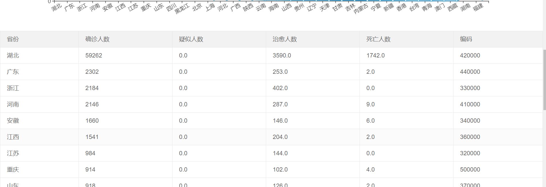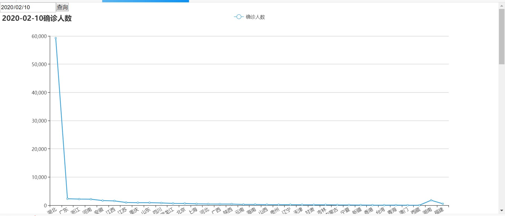 1 <!DOCTYPE html> 2 <html> 3 <head> 4 <meta charset="UTF-8"> 5 <meta name="viewport" content="width=device-width, initial-scale=1, maximum-scale=1"> 6 <link rel="stylesheet" href="layui/css/layui.css"> 7 <script src="js/echarts.js"></script> 8 <script src="js/jquery.js"></script> 9 10 <title>Insert title here</title> 11 </head> 12 <body> 13 <input type="date" name="date"><button>查询</button> 14 <div id="main" style="width: 100%;height:550px;overflow: auto;"></div> 15 <script type="text/javascript"> 16 17 // 基于准备好的dom,初始化echarts实例 18 var myChart = echarts.init(document.getElementById('main'),'light'); 19 20 // 指定图表的配置项和数据 21 22 23 $("button").click(function(){ 24 var names=[]; 25 var nums=[]; 26 $('.head').html(""); 27 $('.main').html(""); 28 myChart.showLoading(); 29 $.post( 30 'http://localhost:8080/yiqing/getData', 31 {"date":$("input[name=date]").val()}, 32 function(msg){ 33 var json=JSON.parse(msg); 34 var size=json.length; 35 for(i=0;i<size;i++){ 36 names.push(json[i].name); 37 nums.push(parseInt(json[i].num)); 38 } 39 40 41 var option = { 42 title: { 43 text: $("input[name=date]").val()+'确诊人数' 44 }, 45 tooltip: {}, 46 legend: { 47 data:['确诊人数'] 48 }, 49 xAxis: { 50 51 axisLabel: {interval:0,rotate:30 }, 52 data: names 53 }, 54 yAxis: {}, 55 series: [{ 56 name: '确诊人数', 57 type: 'line', 58 data: nums 59 }] 60 }; 61 myChart.setOption(option); 62 myChart.hideLoading(); 63 tr="<tr><th>省份</th><th>确诊人数</th><th>疑似人数</th><th>治愈人数</th><th>死亡人数</th><th>编码</th></tr>"; 64 $('.head').append(tr); 65 for(i=0;i<size;i++) 66 $('.main').append("<tr></tr>"); 67 $('.main tr').each(function(i){ 68 $(this).append("<td>"+json[i].name+"</td>"); 69 $(this).append("<td>"+json[i].num+"</td>"); 70 $(this).append("<td>"+json[i].yisi+"</td>"); 71 $(this).append("<td>"+json[i].cure+"</td>"); 72 $(this).append("<td>"+json[i].dead+"</td>"); 73 $(this).append("<td>"+json[i].code+"</td>"); 74 }) 75 } 76 77 ) 78 }) 79 80 </script> 81 <table class="layui-table"> 82 <thead class="head"> 83 </thead> 84 <tbody class="main"></tbody> 85 </table> 86 </body> 87 </html>