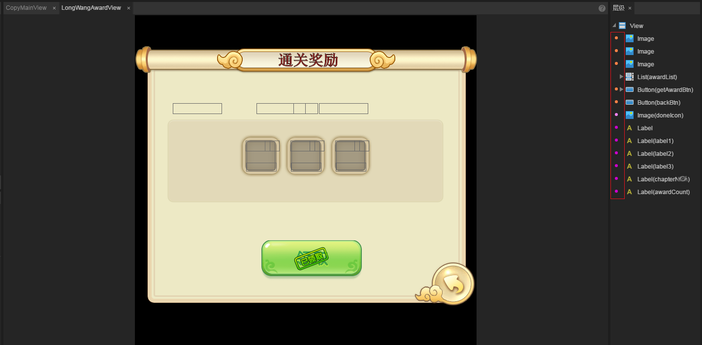 打开UI编辑器的层级管理器,可以直观的看出每一个图片资源的层级关系。通过不同颜色的圆点进行区分。如果相同颜色的圆点被交叉打断,那就会增加DrawCall数量,所以,要通过调整层次关系,让相同颜色圆点的资源顺序排列。