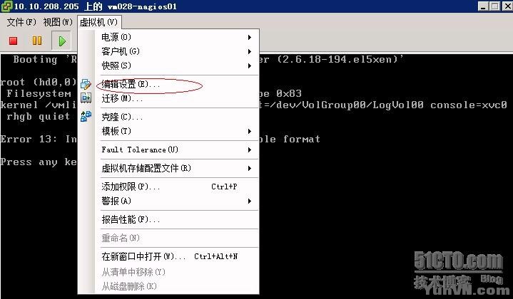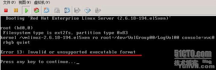 19、但是Linux系统的虚拟机迁移过来后会有点小问题,开机启动后不能进入到系统里,能看到报错信息。如图,原因:经过xenserver修改过的 xen内核不能在vmkernel上运行!所以要更改虚拟机内核。