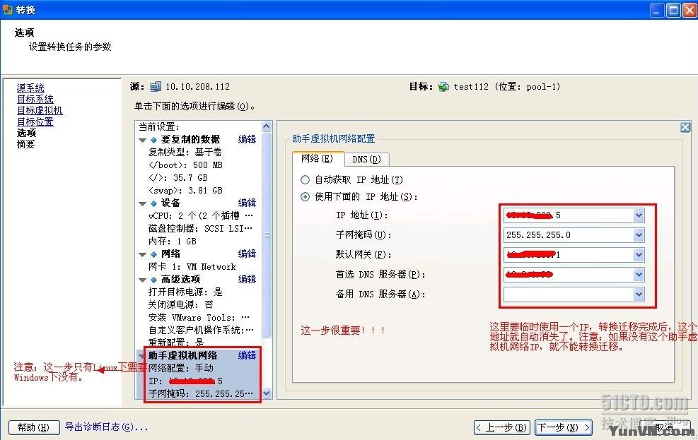 14、这一步很重要,“助手虚拟机网络”只有在转换Linux系统下才有这一不,Windows下就没有。这里要临时使用一个Ip,转换迁移完成后,这个地址会自动消失,注意,如果没有这个助手虚拟机网络IP是不能进行迁移的。