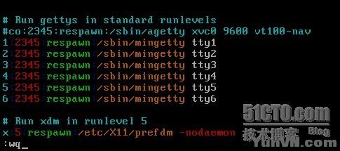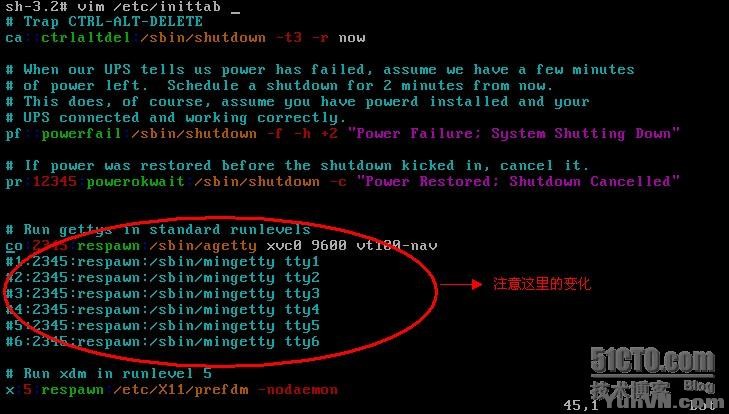 32、编辑 /etc/inittab 文件,注意下面这几行前后的差异,注释掉“co……”,去掉“#1 #2 #3……”前面的#号。