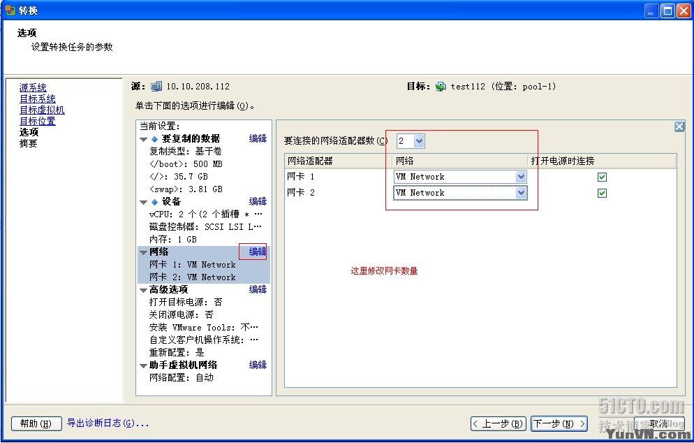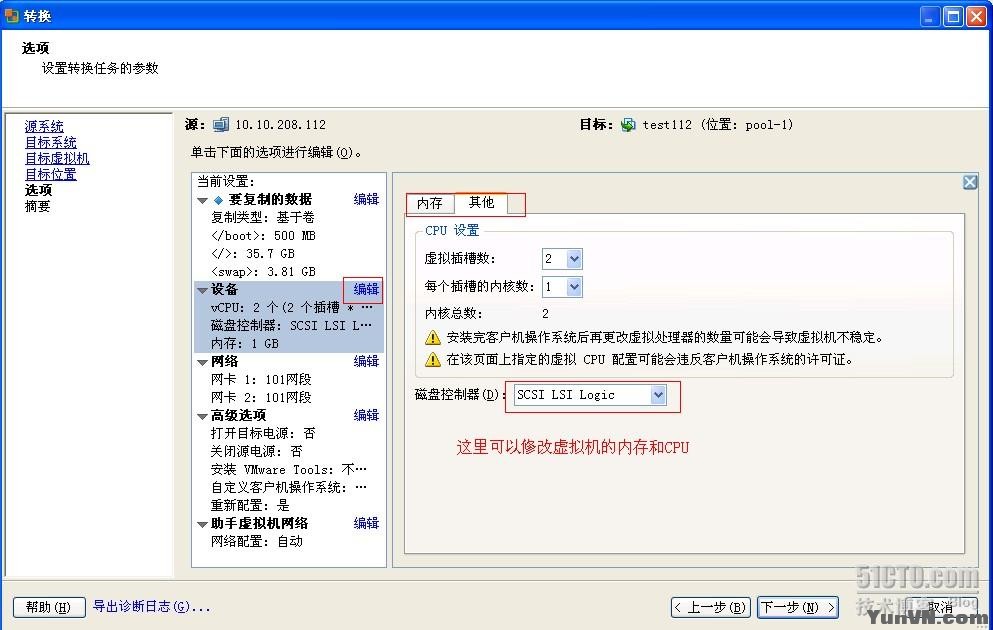 10、在这里可以对目标虚拟机进行一些修改编辑。如:硬盘、CPU、内存、网络等。