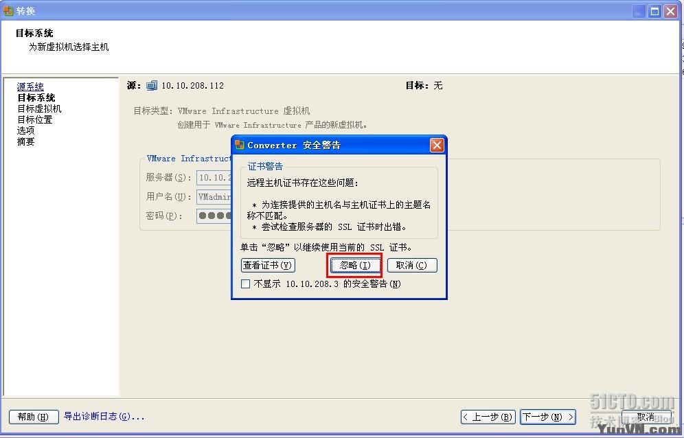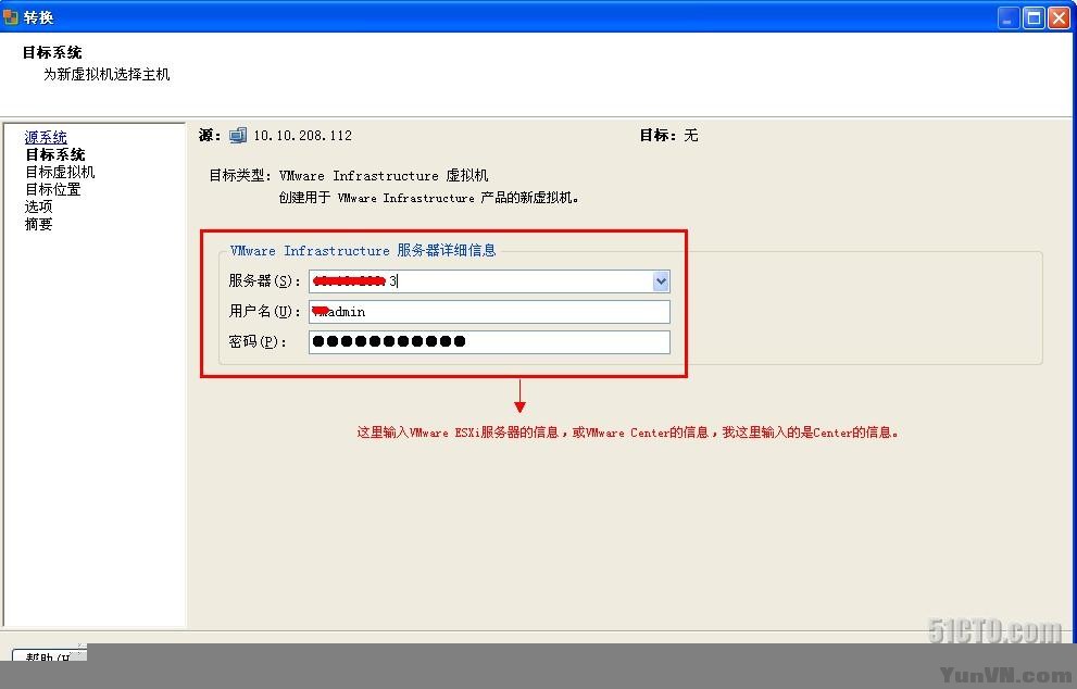 6、成功检索到源计算机后,现在输入目标服务器IP及用户密码。ESXi服务器有使用vCenter就输入vCenter的信息,单个ESXi服务器就输入ESXi的信息。