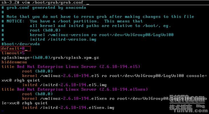 31、编辑 /boot/grub/grub.conf 配置文件,default=0 非xen 内核